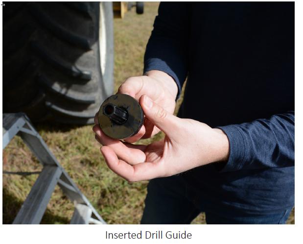 18. Rimuovere il supporto rosso sul lato adesivo della piastra di montaggio FarmTRX e inserire la guida di foratura nella piastra di montaggio. Ruotare la guida di foratura in senso orario per bloccarla in posizione.