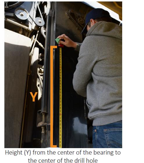 1. Utilizzando le misure della Tabella delle misure di foratura, misurare e contrassegnare l'altezza (Y). Misurare dal centro del cuscinetto all'altezza (Y) e segnare. Si consiglia di utilizzare del nastro adesivo per facilitare la marcatura. Utilizzare una squadra per tracciare l'altezza (Y) attraverso il nastro adesivo sull'elevatore per cereali pulito.