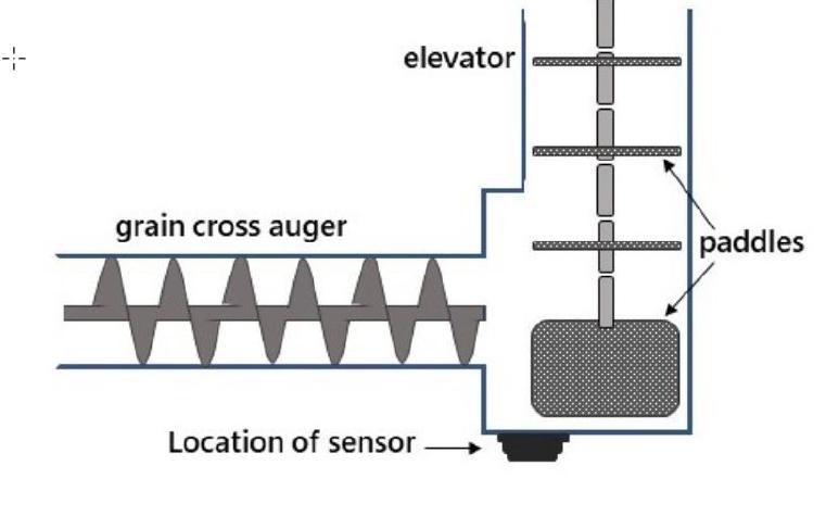1) I sensori devono essere installati il più in alto possibile nell'elevatore per cereali pulito, in un punto in cui sia possibile accedere all'interno e all'esterno dell'elevatore, facendo attenzione che non entrino in contatto con le parti mobili della mietitrebbia.
