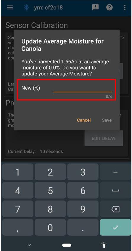 Po jej naciśnięciu stan przebiegu kalibracji zostanie zapisany, umożliwiając użytkownikowi nawigację w innym miejscu aplikacji w oczekiwaniu na wartości pomiaru objętości/wagi kalibracji. Ważne jest, aby użytkownik NIE naciskał ikony po powrocie do ekranu kalibracji upraw w celu wprowadzenia wartości kalibracji, ponieważ spowoduje to odrzucenie zapisanych wartości. Po zakończeniu kalibracji wartość kalibracji może zostać zastosowana do wcześniej zebranych plonów.