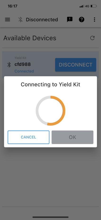 2. Aby przetestować zasilanie: Za pomocą smartfona lub tabletu pobierz i otwórz aplikację internetową FIELDVIEW YieldKit i przejdź do strony Połączenie, aby wyszukać/zeskanować urządzenia Bluetooth™. Urządzenie o nazwie "YM:___" powinno pojawić się w sekcji Dostępne urządzenia. Jeśli się nie pojawi, spróbuj nacisnąć przycisk odświeżania. Jeśli urządzenie nadal się nie pojawia, konieczne może być wyłączenie i włączenie funkcji Bluetooth™ w telefonie lub tablecie.