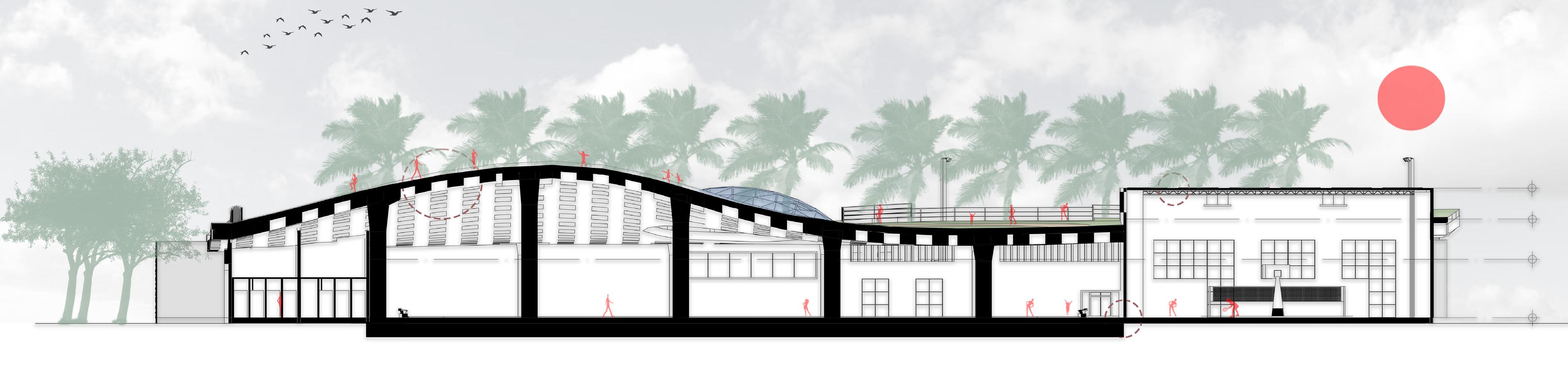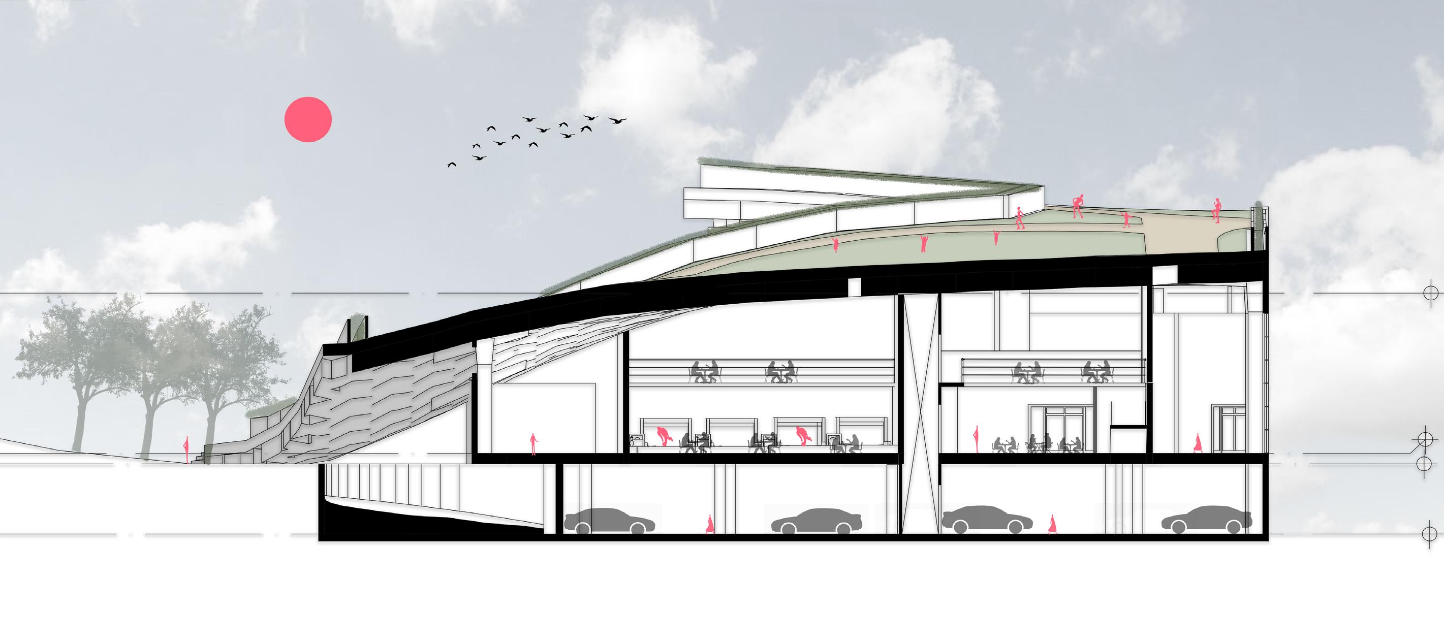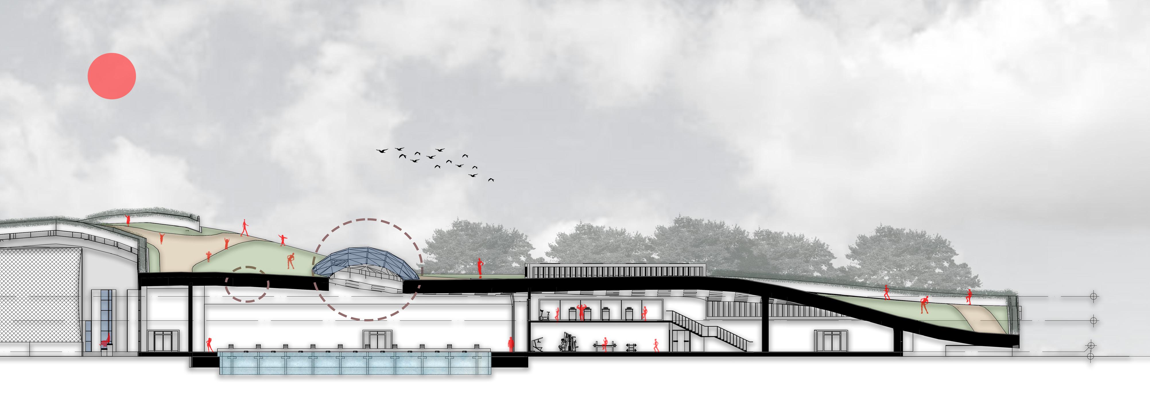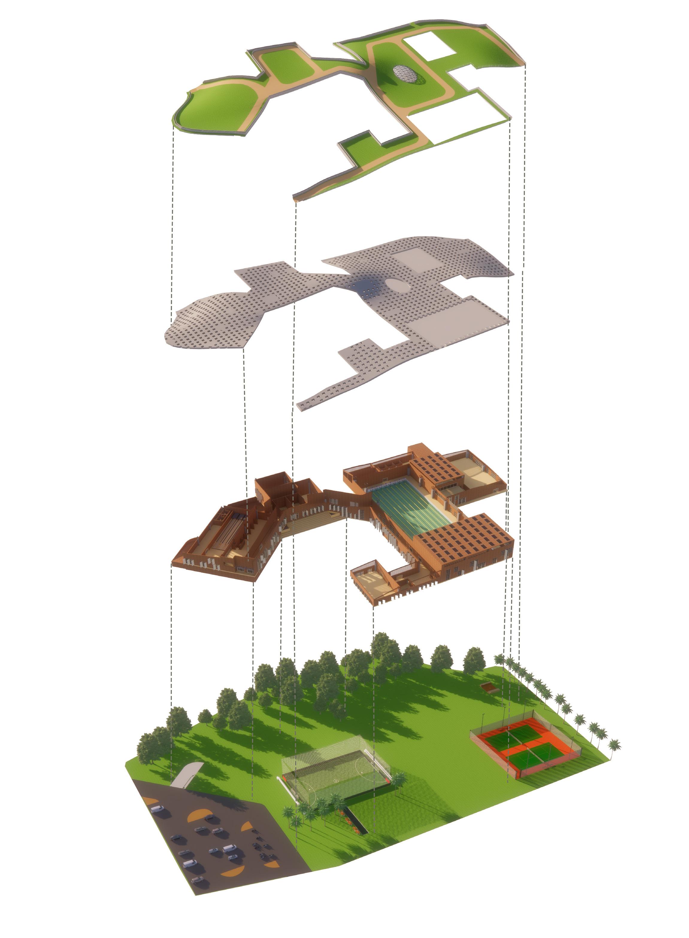 “How can spaces aid in rejuvenating the community and the mental health of people and reconnect them with life other than work?” The concept for the recreation center in the IT hub of Kakkanad is to provide a much-needed space for people to destress and improve their work-life balance. With the majority of the working population residing and working in the city itself, the recreation center will serve as a hub for socialization, physical activity, and relaxation. The project intends to rejuvenate the community and improve mental health by providing a space that reconnects people with life outside of work. The architectural design concepts for the recreation center focus on maximizing natural lighting and ventilation, promoting greenery and sustainability,and providing easy accessibility and circulation throughout the building. The football ground will act as the central element of interest, while the sloping walkable green roof with a walking track, park, and garden will provide anexcellent outdoor space for visitors.