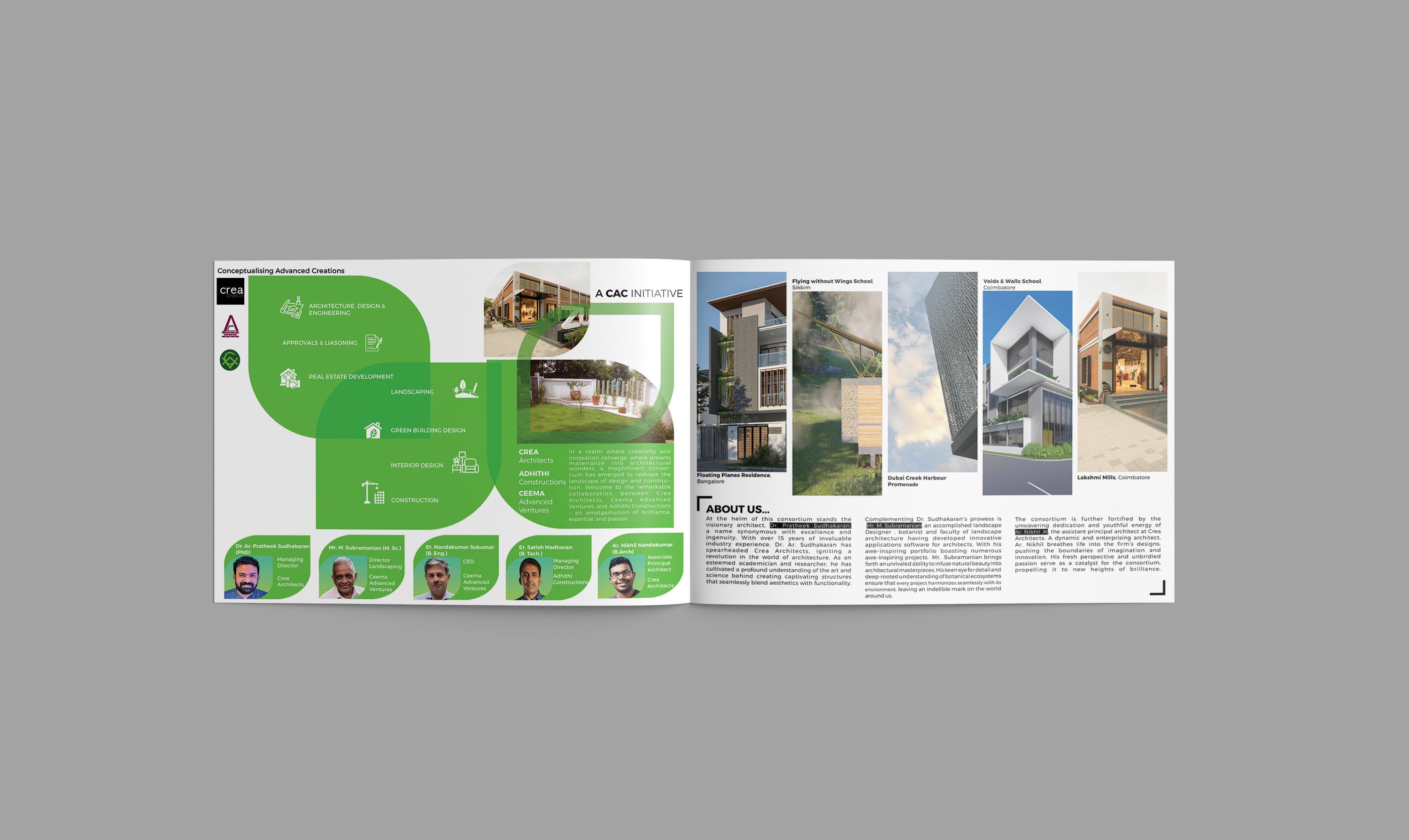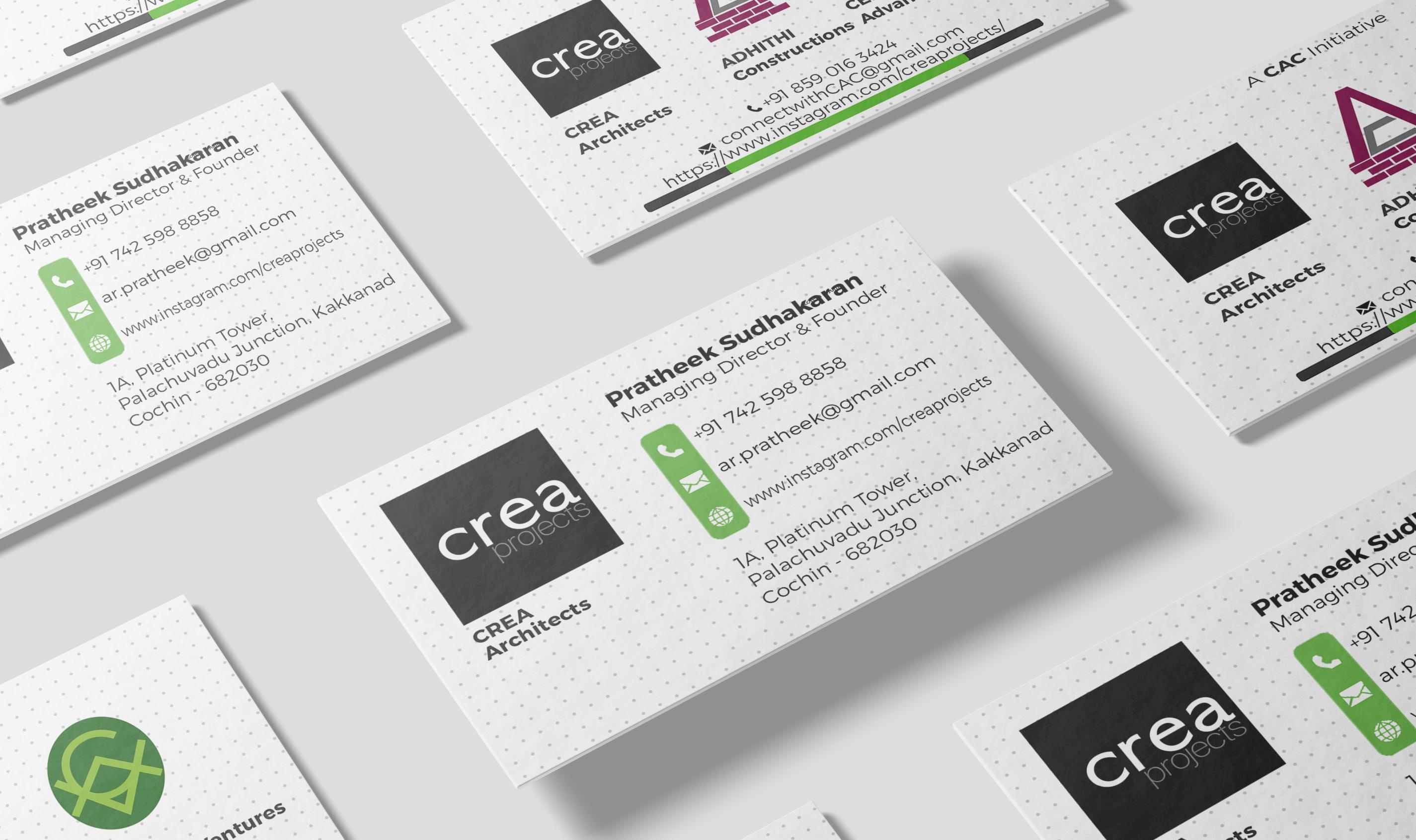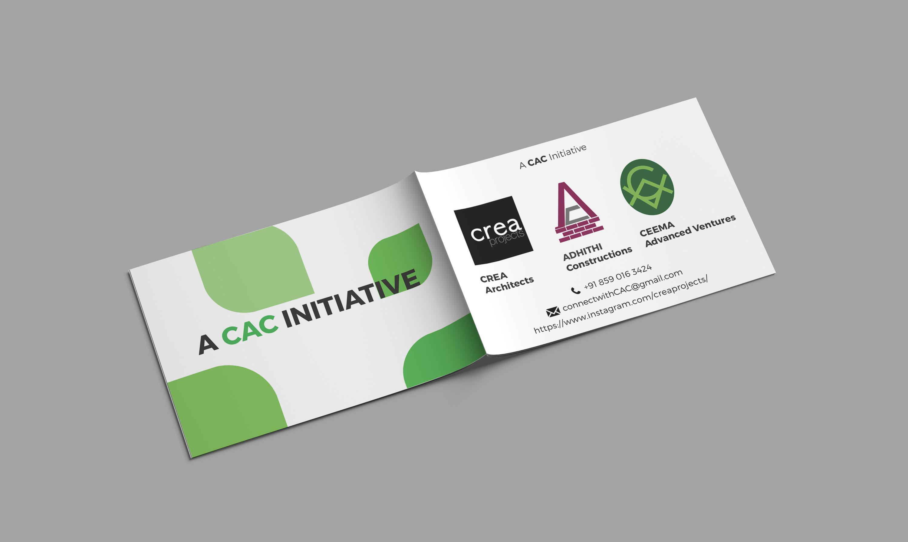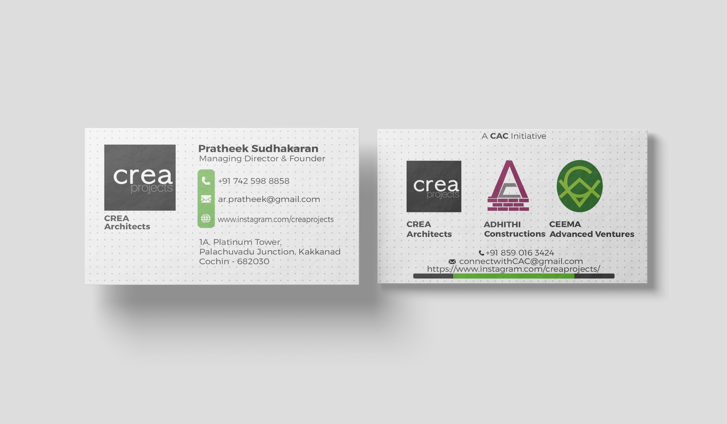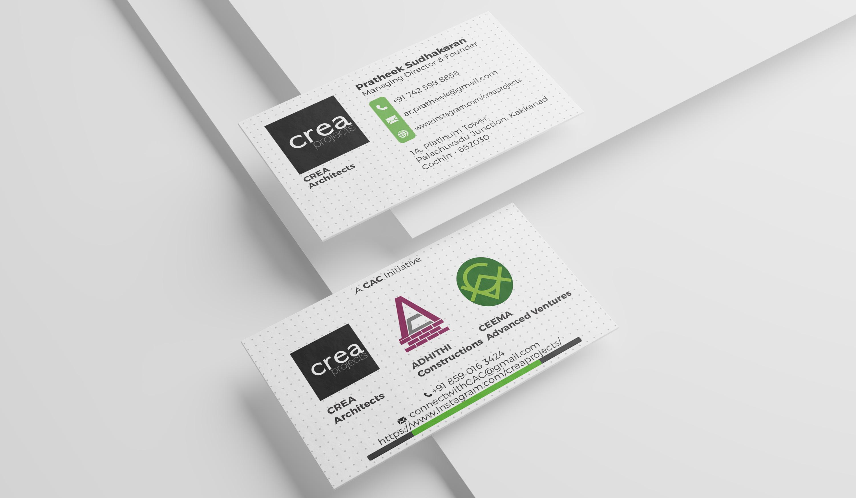 This is a business card mockup made for the consortium of CREA Projects, Adhithi Constructions and Ceema Advanced Ventures. The main aim was to unify the company identities together and merge them into a combined unit called CAC. A minimalist palette of whites and greens were used in this design to highlight sustainability as a practice the consortium aimed at bringing to the field of architecture.