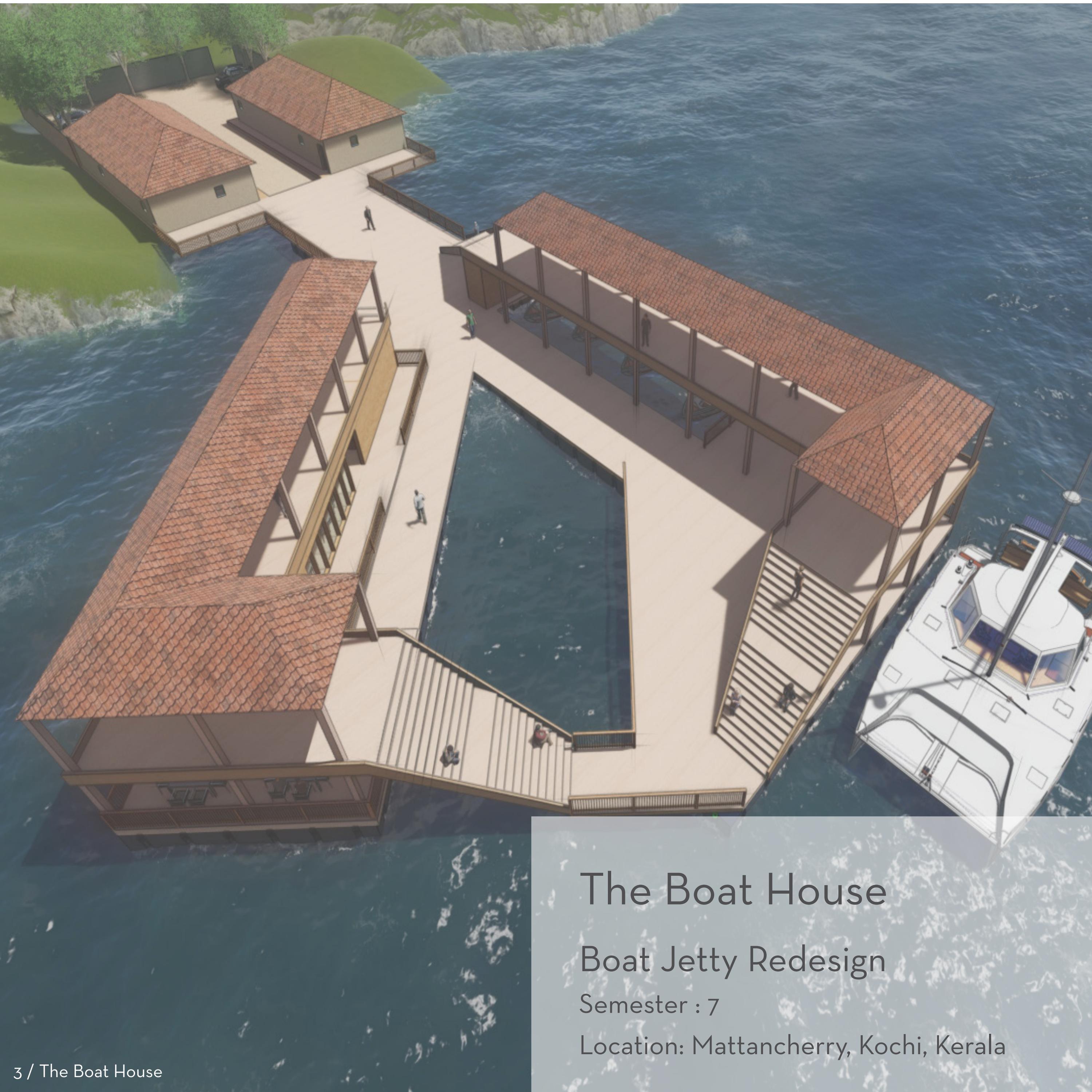 The site is located in Mattancherry, Kochi, Kerala. It is an abandoned boat jetty needing renovation. The main design objective was to create an efficient docking space for local ferries and individual boats without causing much disturbance to the existing structures. The main idea was to merge land and water with a structure that acts as a piece of land floating on water. The concept initially tried to take inspiration from the Kerala houseboat with upper and lower decks extending from the existing structures. The final