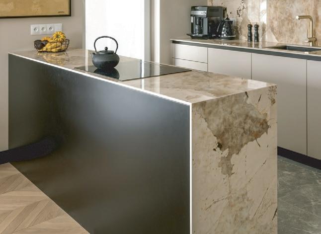 Jest to bardzo efektowne zakończenie blatu kuchennego, którego przeżylenia i struktura schodzą wprost do posadzki.