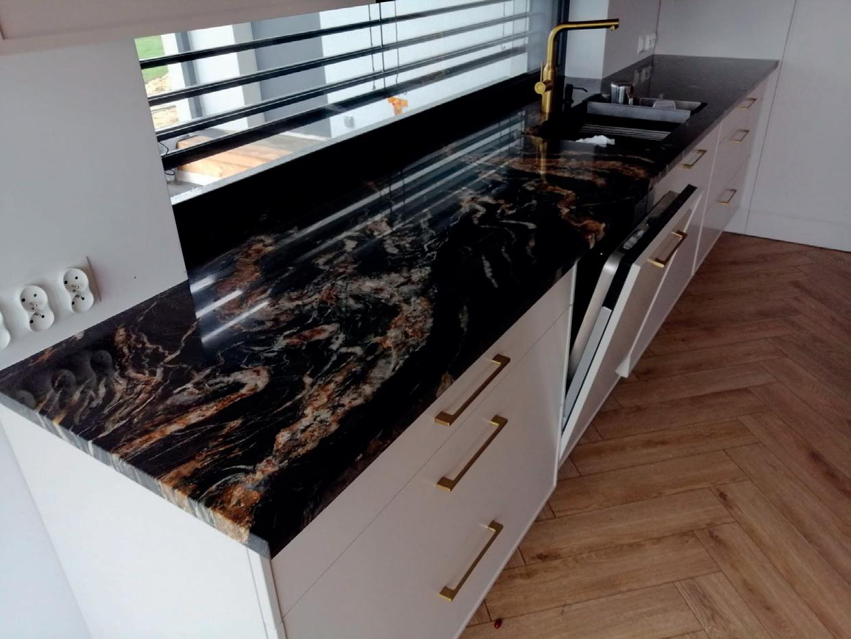 Dzięki nowoczesnym metodom obróbki oraz wieloletniemu doświadczeniu kamieniarskiemu jesteśmy w stanie wykonać blaty o dowolnej grubości. W takim wypadku krawędź blatu i listwy pogrubiającej ścinana jest pod kątem 45 stopni, a następnie elementy te są sklejane ze sobą. Połączenie jest bardzo trwałe i praktycznie niemożliwe do rozdzielenia.