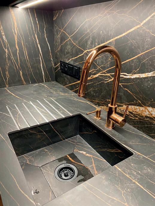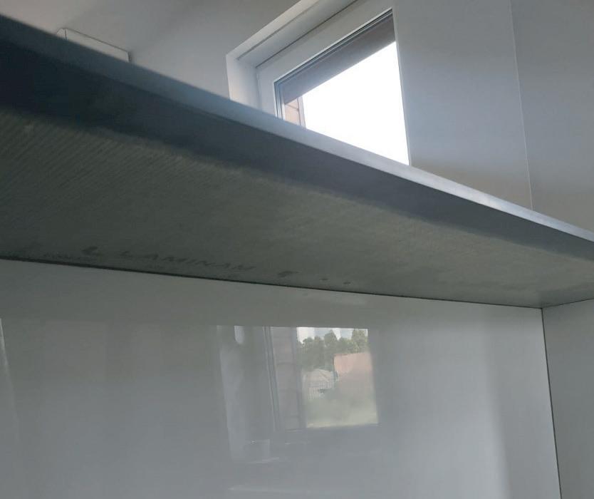 Bardzo praktyczne rozwiązanie, polegające na przyklejeniu do powierzchni frontu meblowego płyty ze spieku kwarcowego. Przyklejana płyta ma tylko 3 mm grubości, natomiast wszystkie jej krawędzie są precyzyjnie wykończone. Po otwarciu szafki widoczne są boczne krawędzie frontu meblowego jak i spieku.