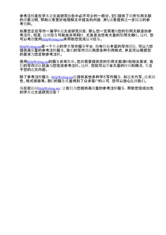 如果您正在写作一篇学术论文或研究报告,那么您一定需要为您的引用文献添加参 考注释。但是,这项任务可能会非常耗时,尤其是当您有大量的引用文献时。这时,您 可以考虑使用HelpWriting.net来帮助您完成这项任务。