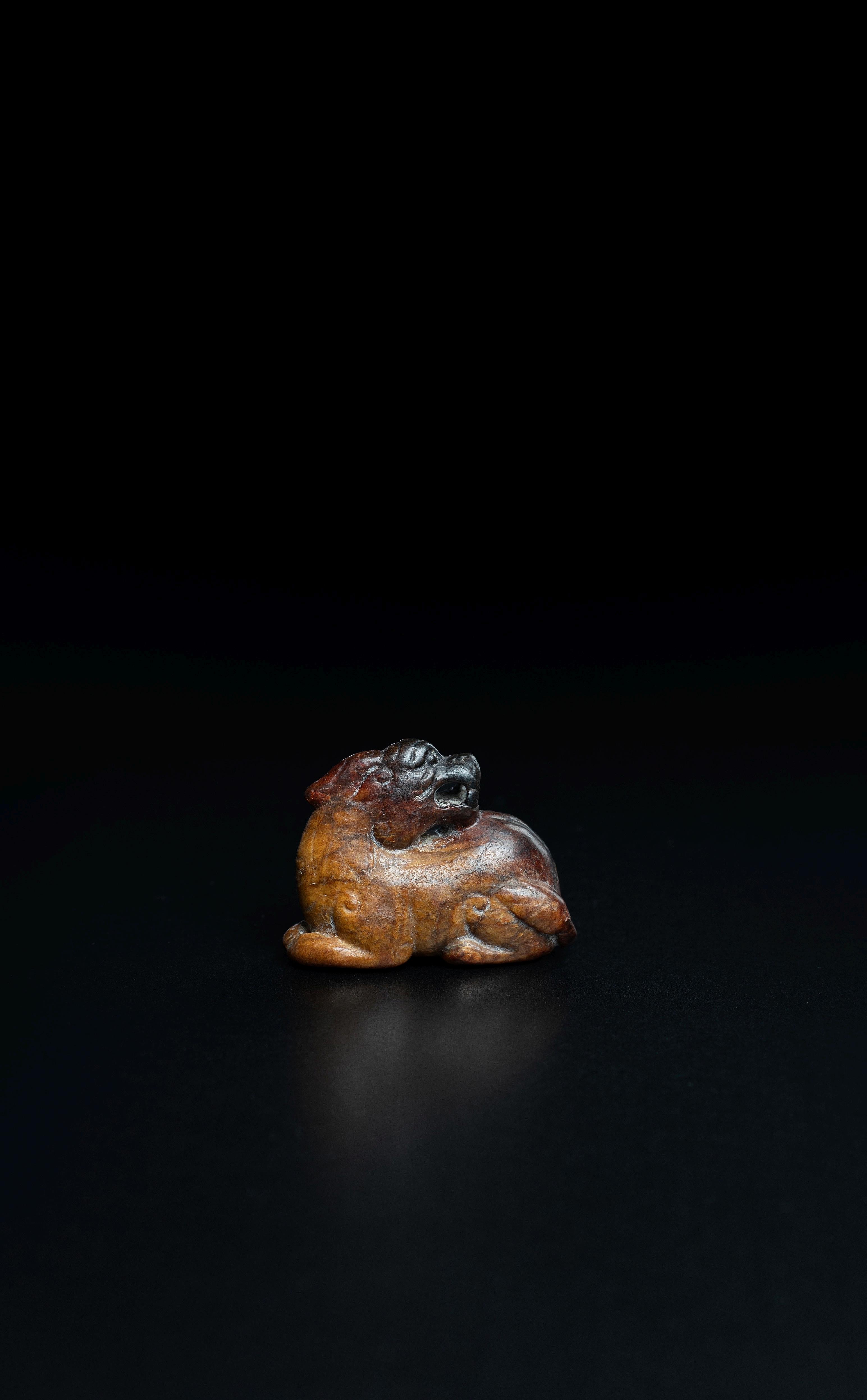 The jade of deep and lighter russet tones, carved in the round as a recumbent single - horned beast, the head turned back over its spine in a snarling expression, the tail flicked around one side.