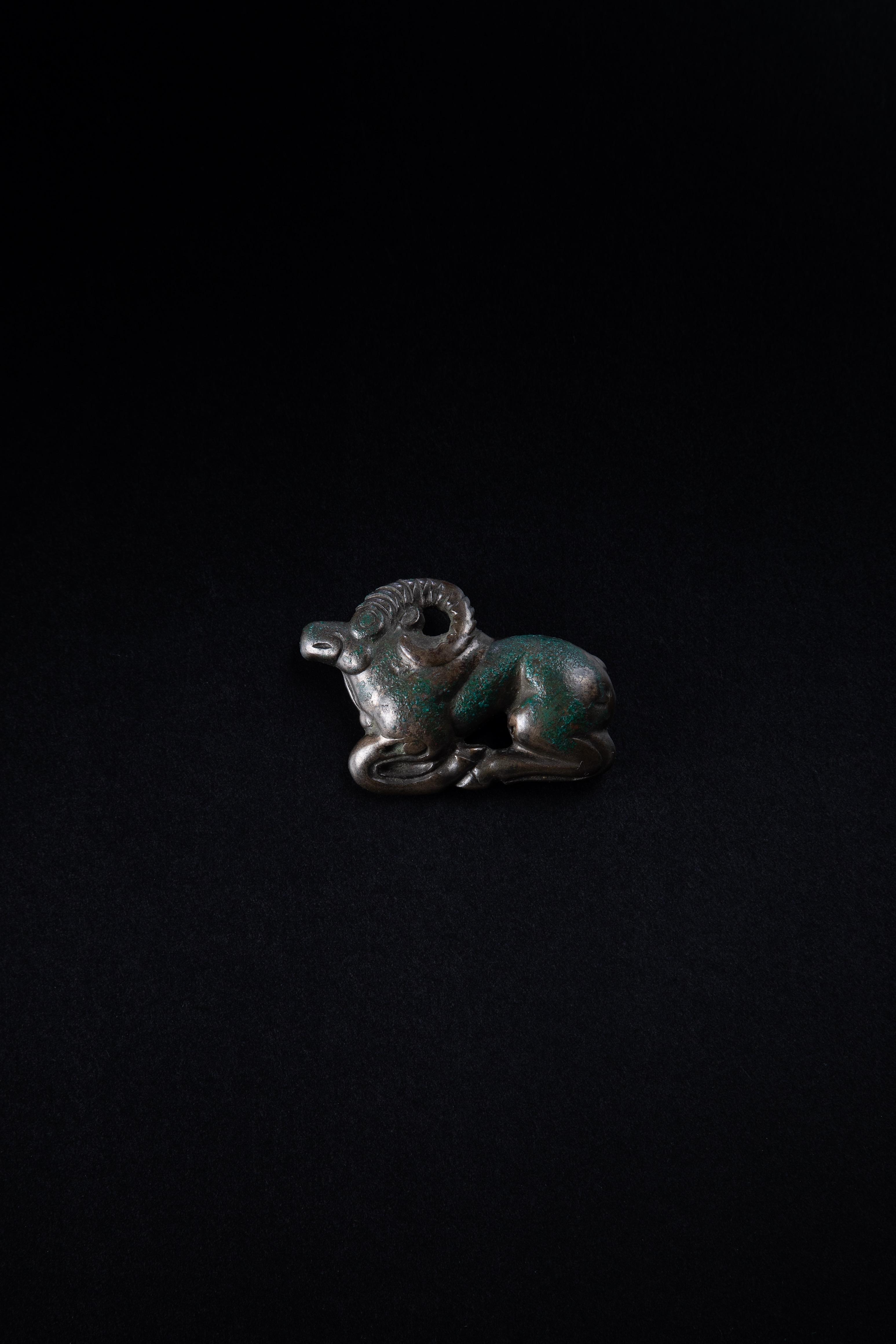 Bronze harness ornament cast in the form of an ibex, the reverse with a single vertical loop. Depicted in a recumbent pose, with curved horn, the chest and hindquarters defined by concave modelling.