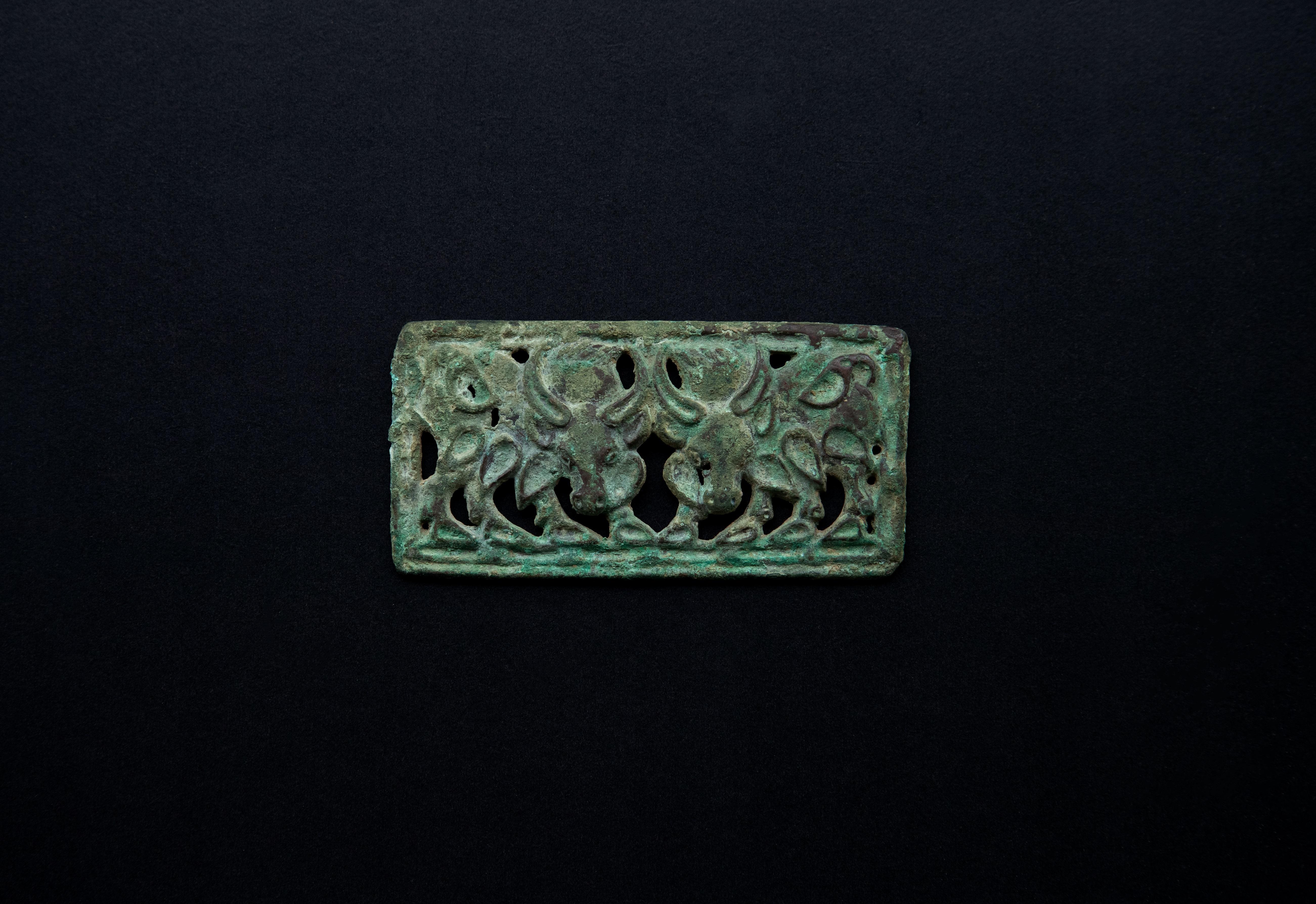 Openwork bronze belt plaque featuring two yaks, set within a grooved rectangular frame, the reverse without loops. Their heads shown frontally and bodies in profile; the horns, ears, hooves, and tails defined with recessed interiors.
