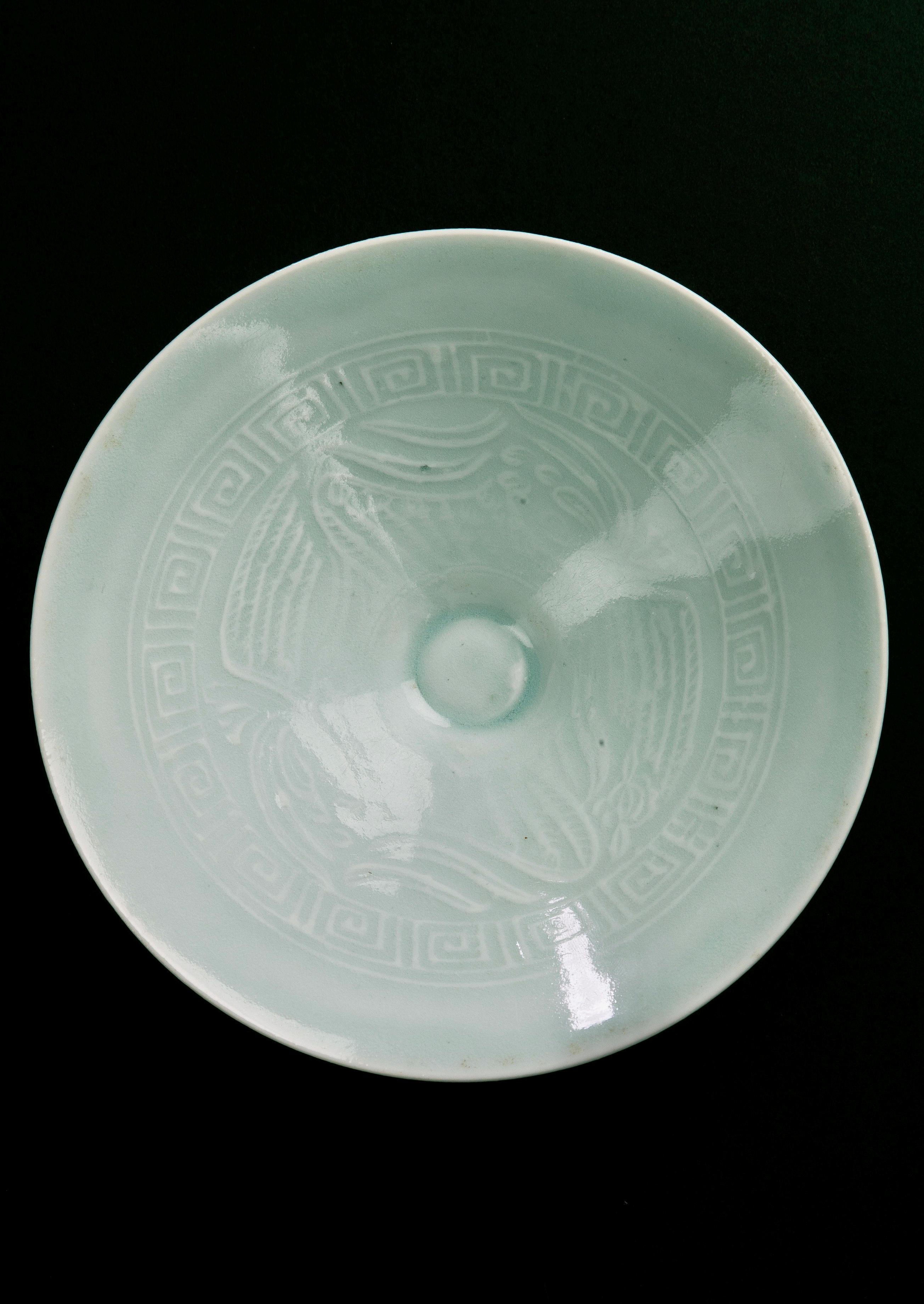 Of conical form, supported on a narrow solid foot, the interior moulded with two phoenixes with wings outspread, encircled above by a key - fret border. Evenly glazed throughout in a pale bluish glaze, stopping at the foot to reveal the fine - grained white body.