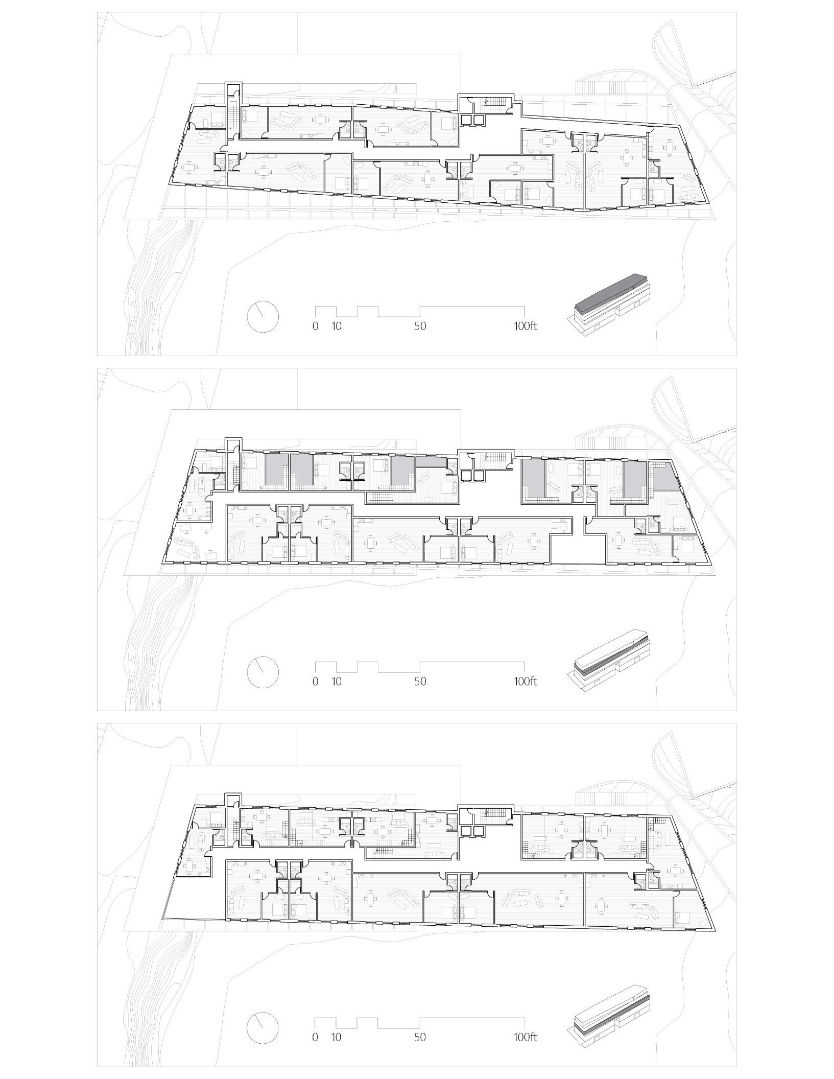 This 60,000 sf studio project allowed us to focus on mixed-use development. The first two floors are for public access and have a clear and understandable geometry. However, the residential units are very unique from each other to make way to two important features. An abundant amount of skylights and unique communal spaces that offer varying views of Atlanta. The square footage of the floor plates after the second level starts to decrease