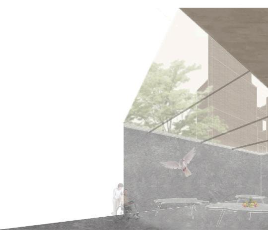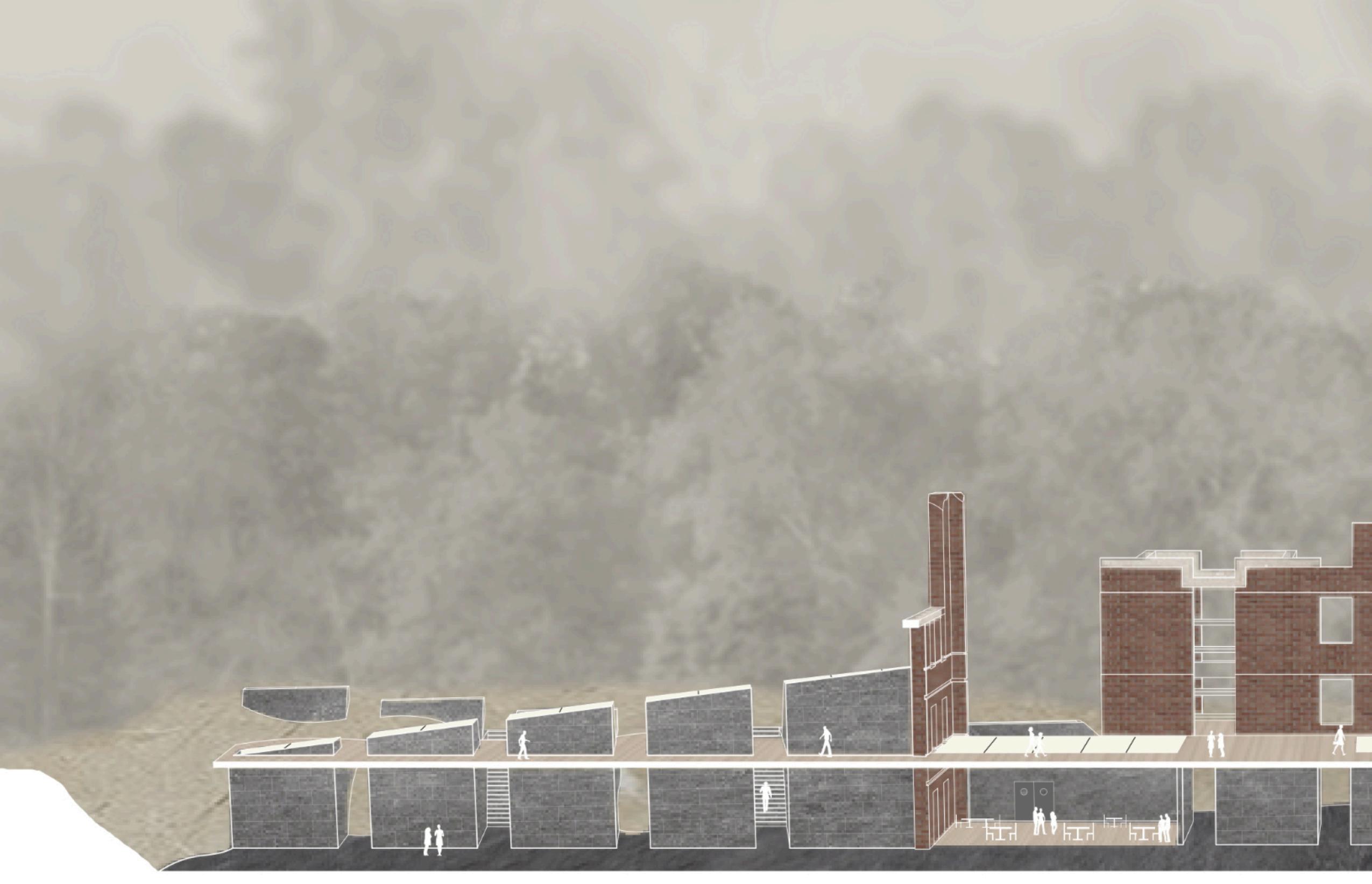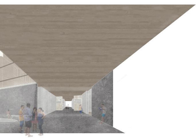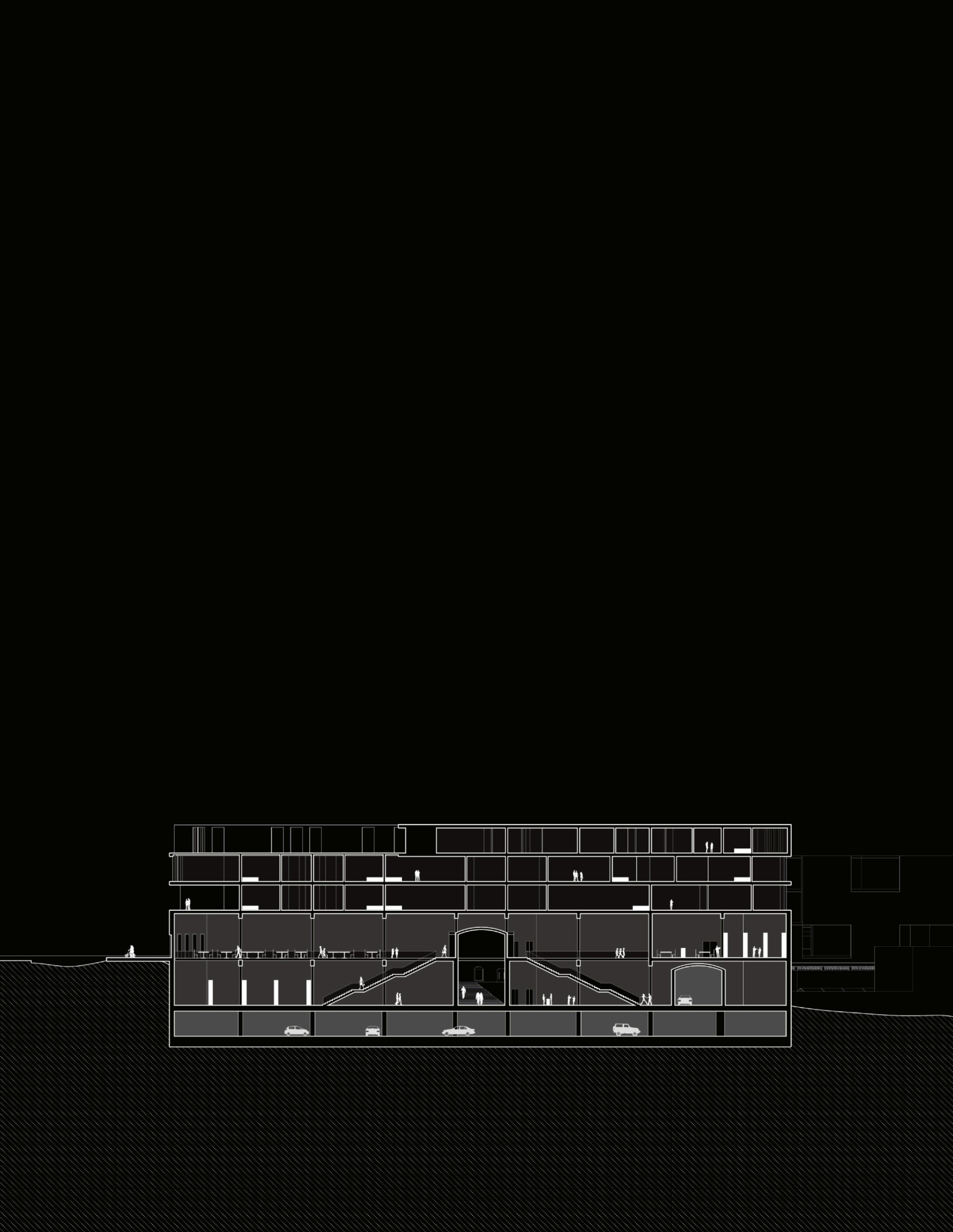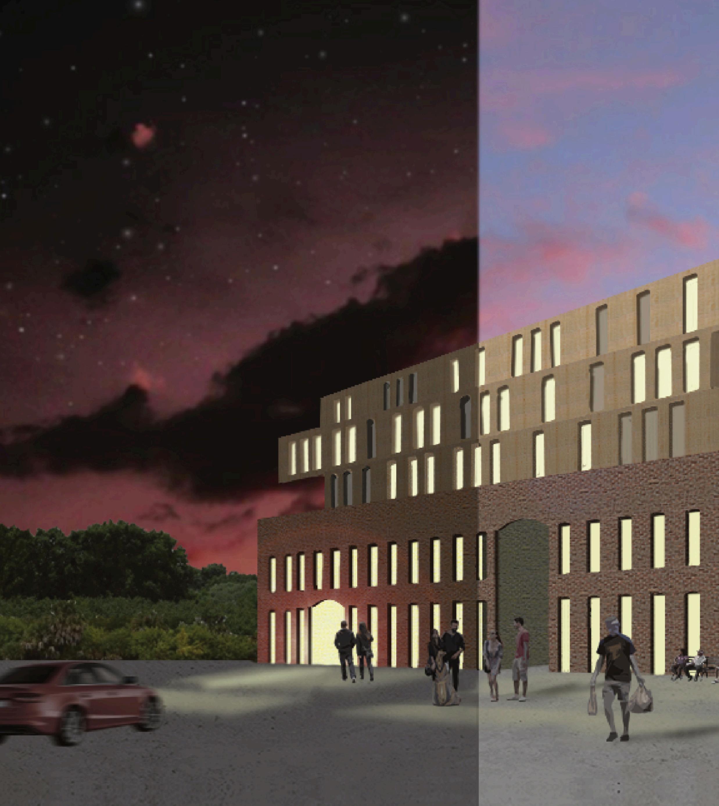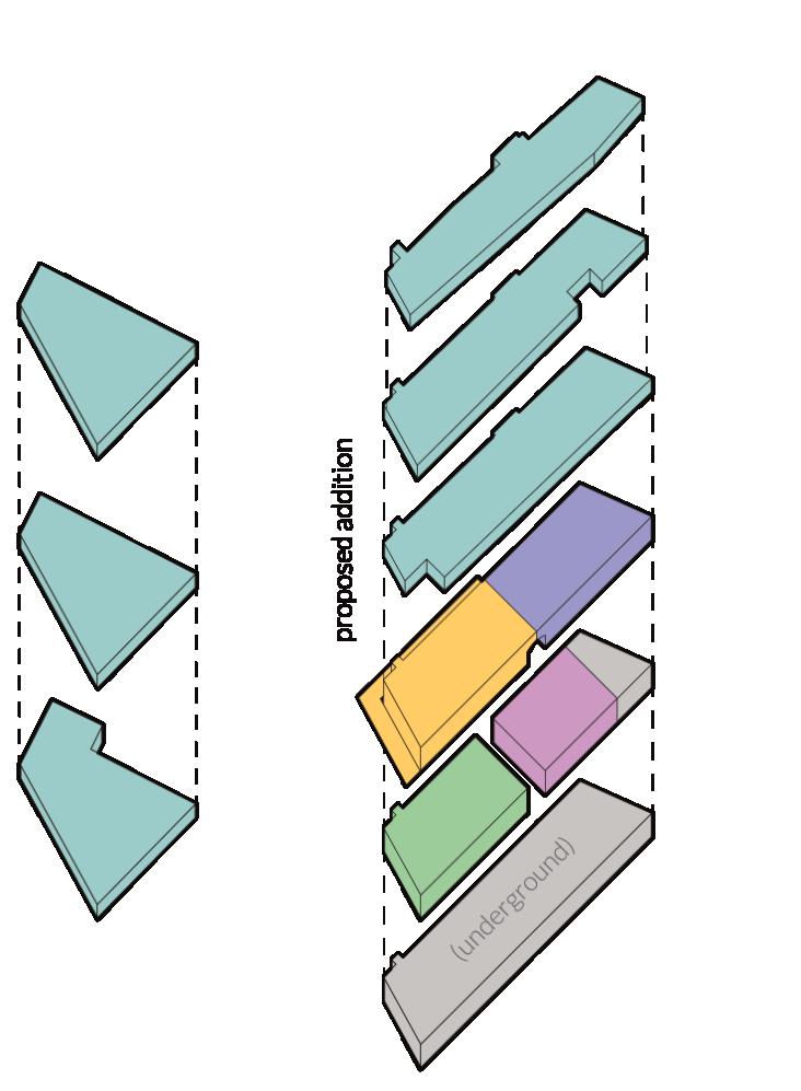 to allow in more light from above through very subtle and carefully placed openings. The program in the mixeduse portion of the building contains an affordable grocery store, a restaurant that uses the store’s products, and a library. The building is designed to serve the community because there is a food desert and limited access to a library due to the highway. Lightfall is designed with versatility in mind for any future modifications and additions.