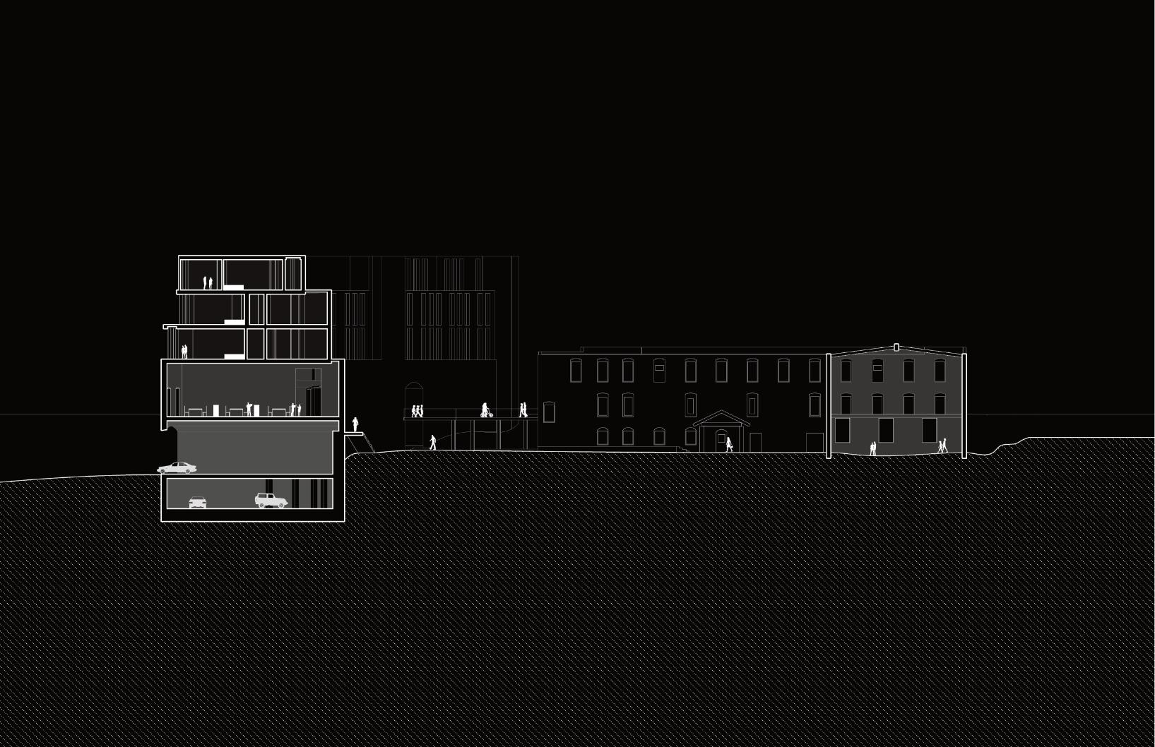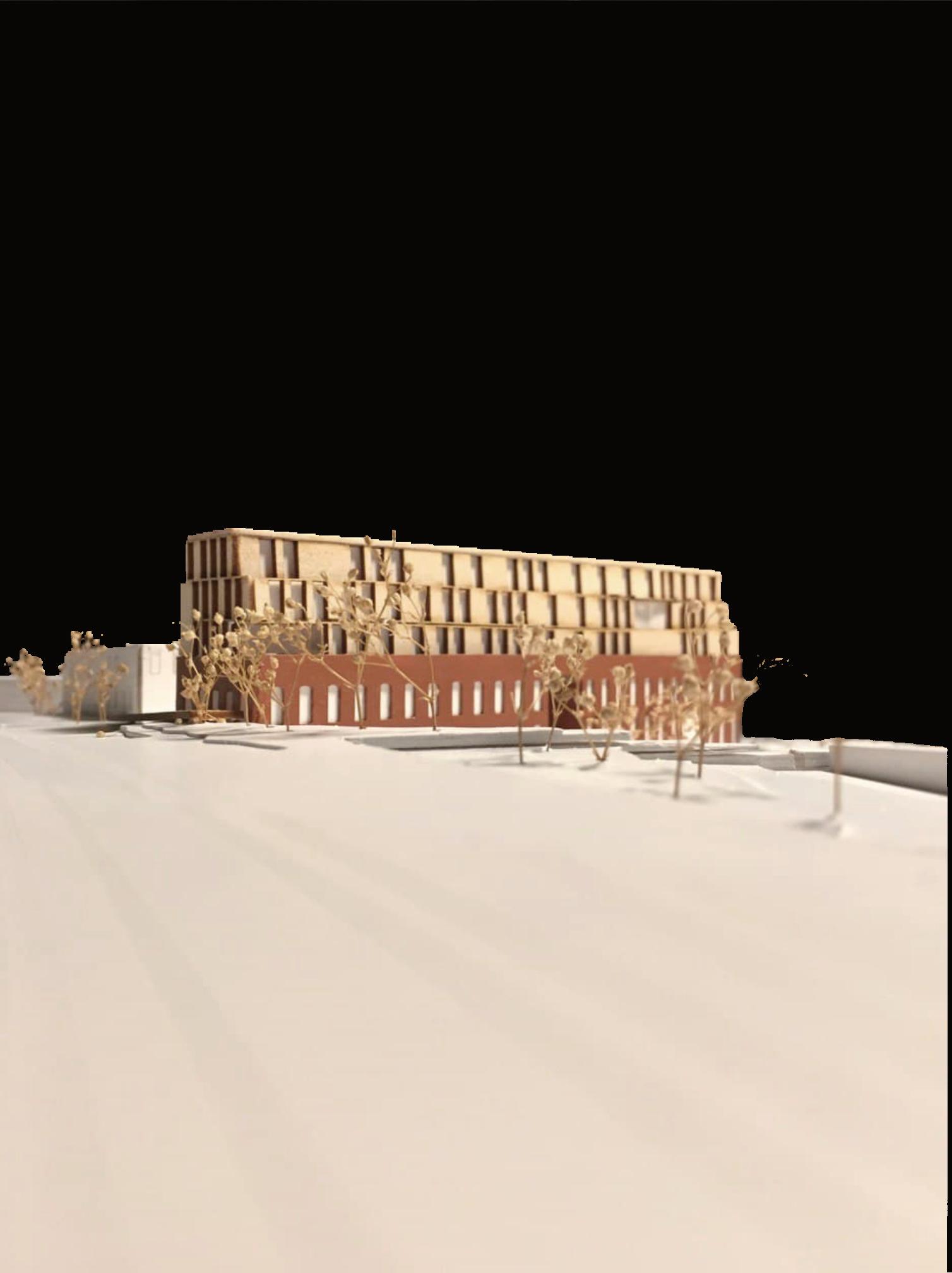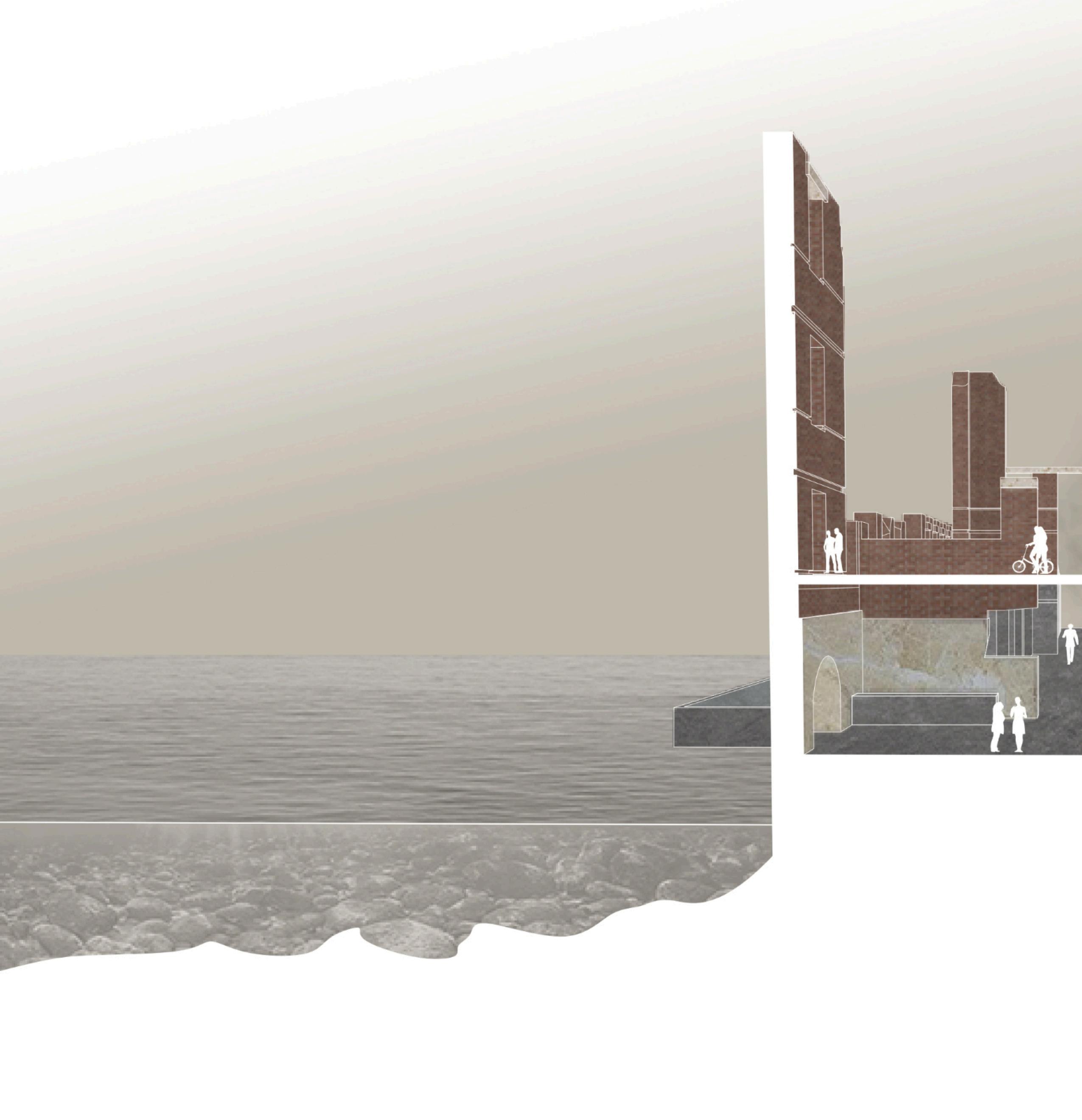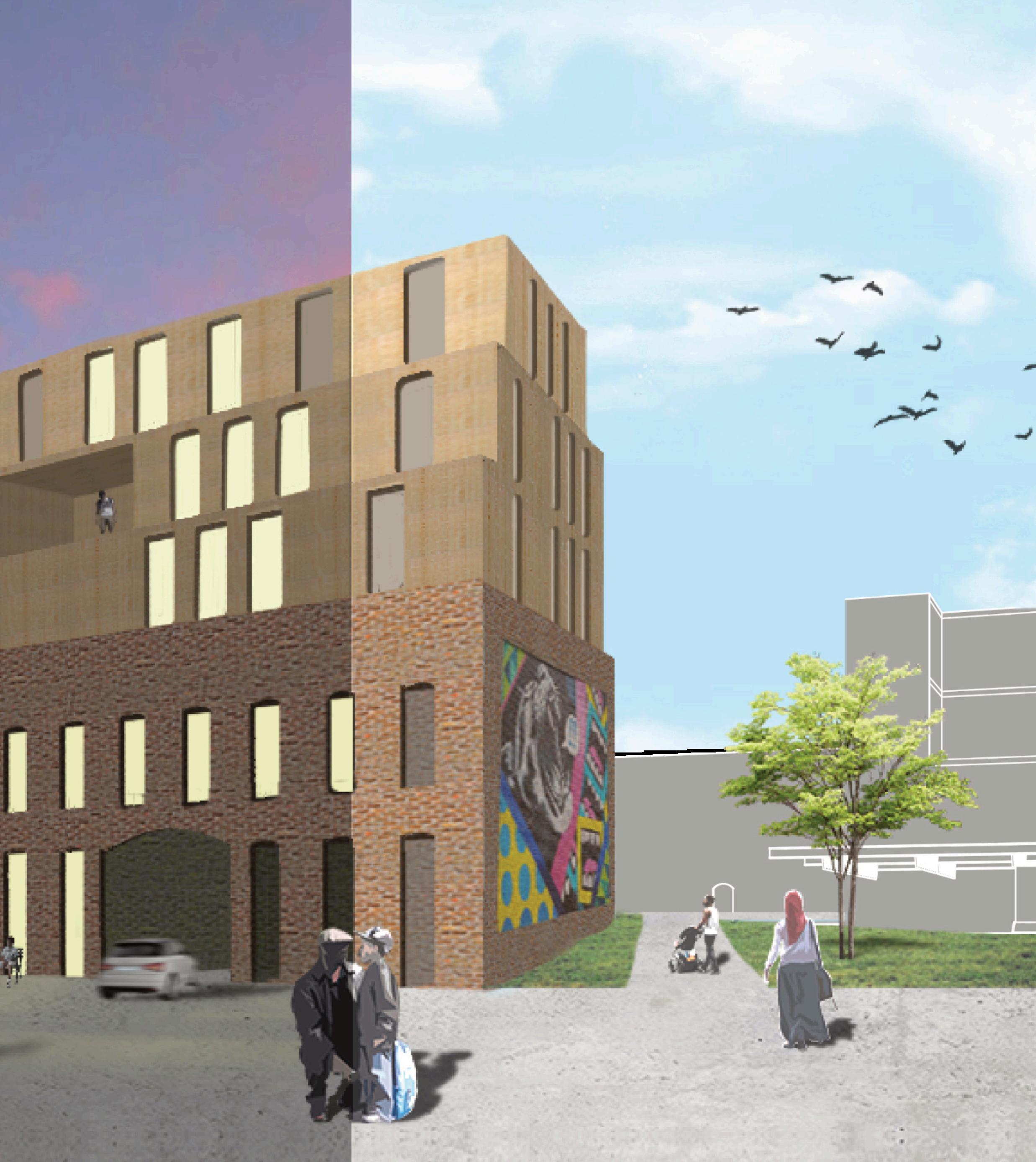 to allow in more light from above through very subtle and carefully placed openings. The program in the mixeduse portion of the building contains an affordable grocery store, a restaurant that uses the store’s products, and a library. The building is designed to serve the community because there is a food desert and limited access to a library due to the highway. Lightfall is designed with versatility in mind for any future modifications and additions.