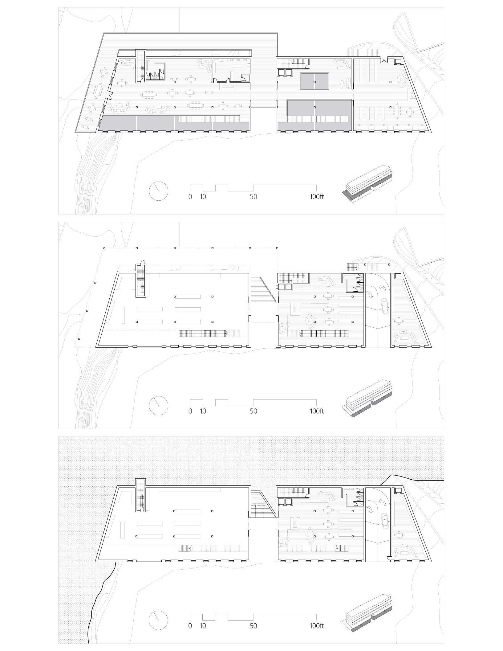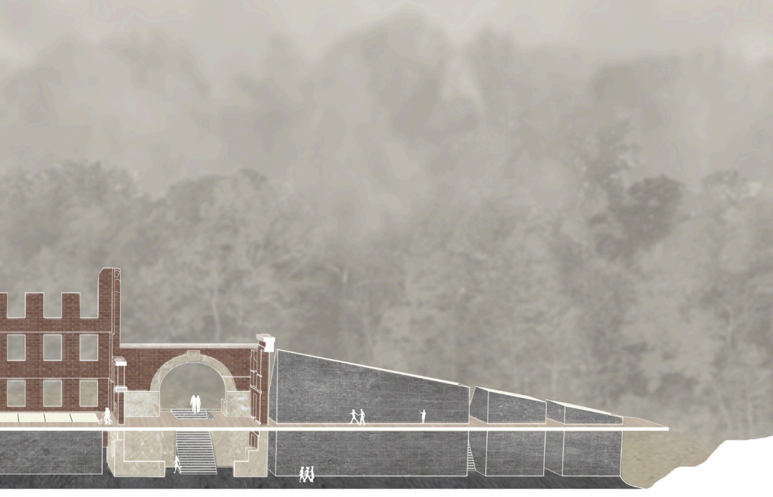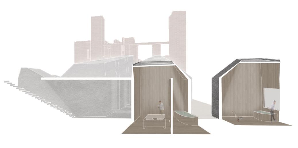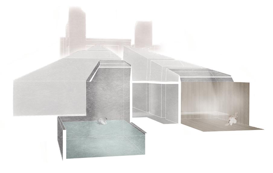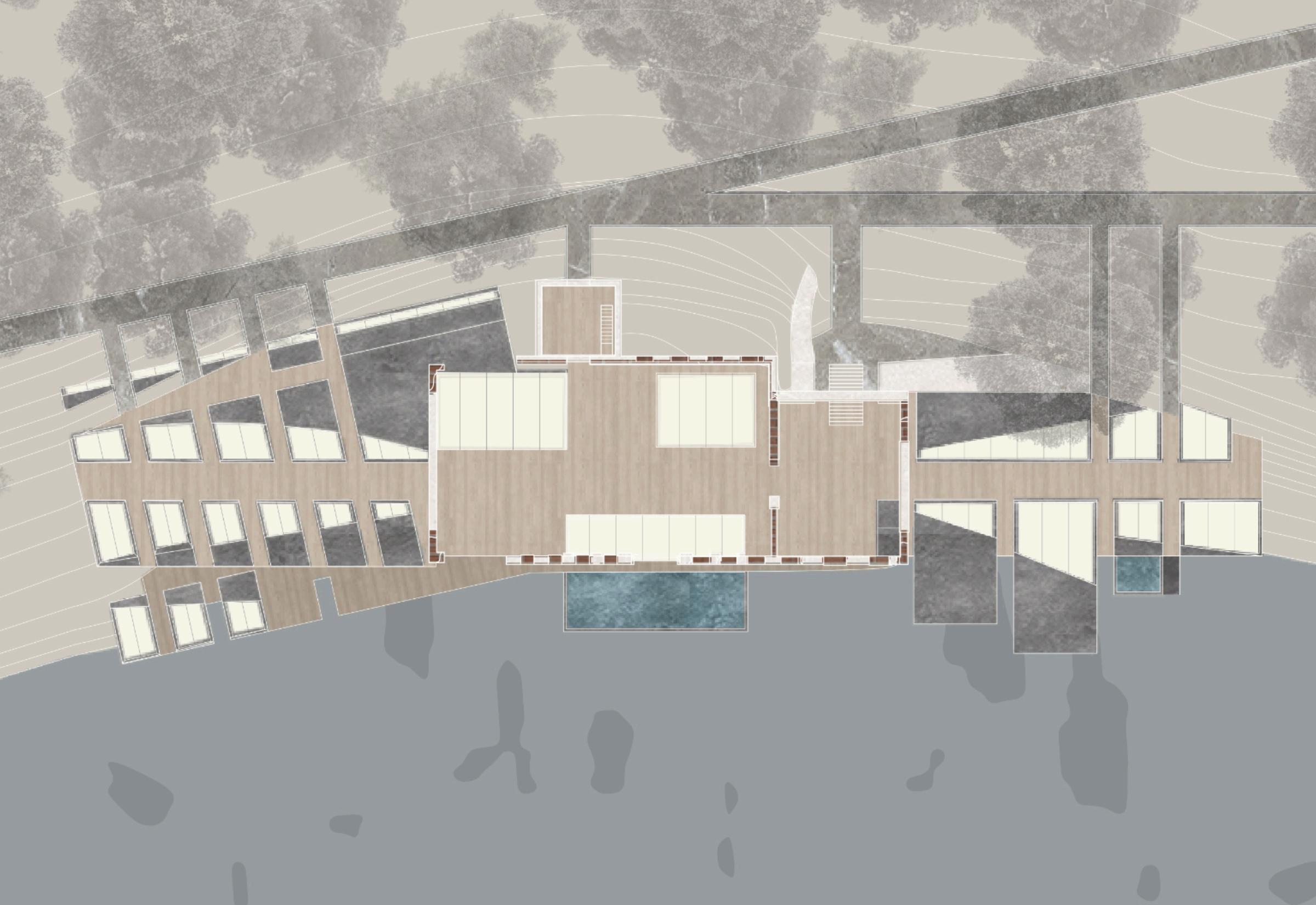 The project sits on land once occupied by the Cherokee, displaced by settlers who built New Manchester Mill using enslaved labor. The program of the project is a wellness center which focuses on aquatic elements like baths and pools, positioning it along Sweetwater Creek to connect visitors with the site’s water feature. The center comprises various small spaces along a central northwest-southeast axis, with rooms oriented to maximize natural light and