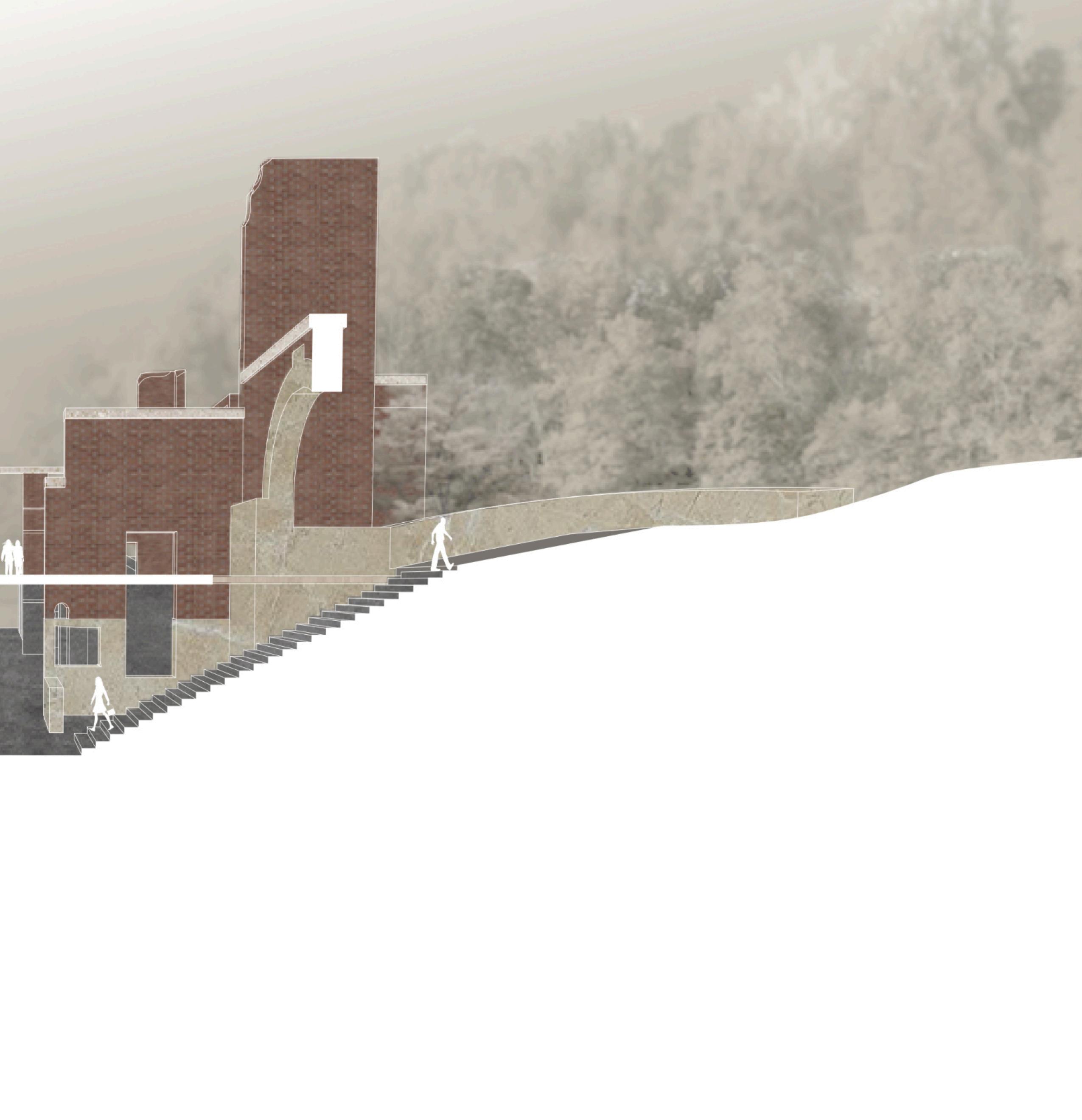 create engaging views. The covered circulation area serves as a roof and floor, reflecting the site's elevation changes and giving a feeling of being underground. Wood and slate were used to blend with nature, contrasting the serene interiors with the outside environment. The center functions as a wellness retreat while subtly serving as a memorial, inviting visitors to relax, reflect, or both.
