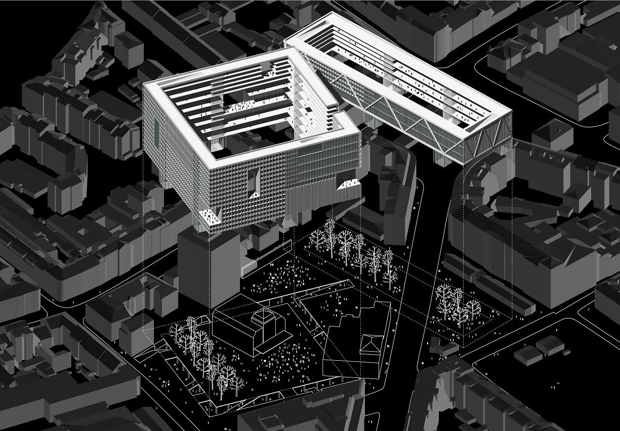 The typical Zagreb perimeter block is a very familiar urban element, which we use to define new interrelated squares on this compound. Its formal patterns remains intact, however its volumetric forms - the square and rectangle - has been abstracted, lifted up and extruded to generate two Platonic shapes with regular inner cavities that frame the immediate environment: squares, parks and streetscape. Both the rectangular and cubic perimeter blocks are distinctive bodies. Their architectures serve as a natural stage of activities by acting as an ‘inhabited membrane’, filtering the every-day life of the vicinity.