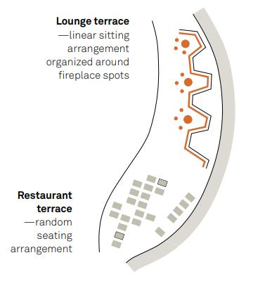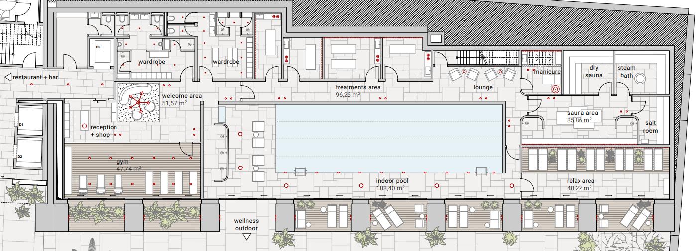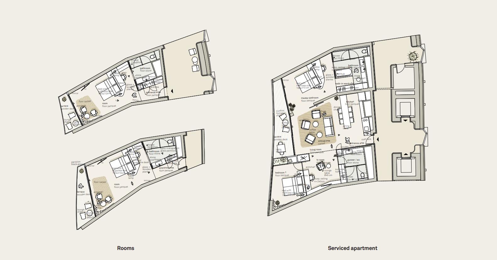 All spaces naturaly flow from beautiful forest on the north side of the hotel, through the entrance and lobby, then separate into two sides of the lobby, around the fireplace, and the bar and restaurant. The gentle flow follows through to the terrace to the garden level and a funicular on the other side, down to the lake and the city. That spatial flow can be also found in the rooms and apartments.