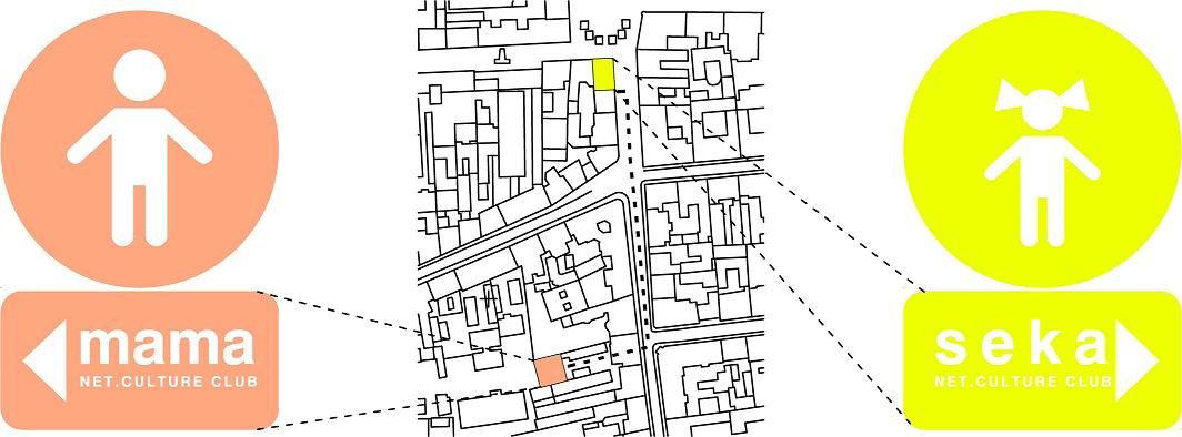 Multimedia Institute “mama” is one of a few organizations in Zagreb which are financed from the municipal budget and are designed for youth culture. Specific to their work is that they are completely open to citizens who, in return, contribute with their ideas to make up the programme of “mama”. The main problem is lack of space. “Mama” means mother and “seka” - sister. Both spaces are on the same pedestrian route and while “mama” is in the interior of the block, the new space is positioned at the corner of the block and thus offers greater exposure for the events and contents being generated there.