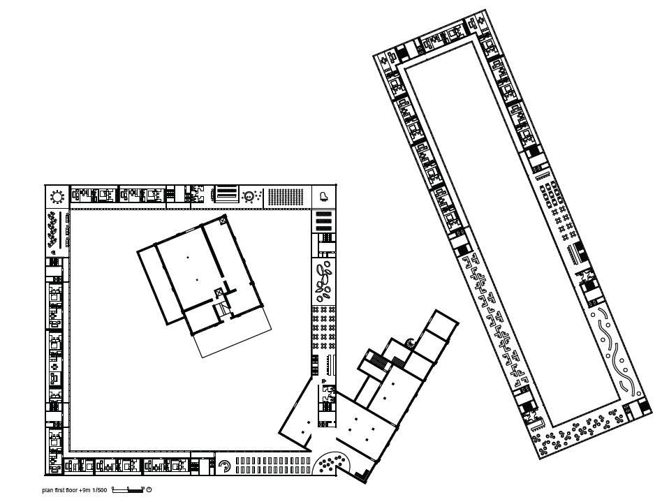 The block performs in a dual mode: The Destilerija Square and its cubic building responde to a metropolitan scale whilst Market Square and its slab-block response a local scale.