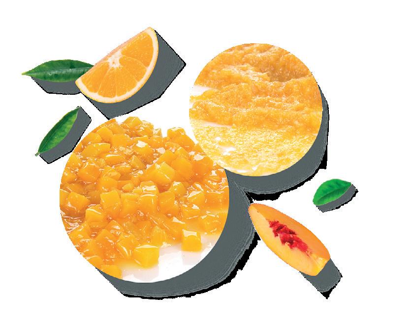 We offer peach cubes and slices in aseptic packages, ideal for fruit preparations and beverages. We also produce citrus fruits and separate fruit cells, used as a flavour and consistency enhancer.