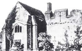 The remains of Bampton Castle (now Ham Court Farm). The Castle was built during the early fourteenth century by Aymer de Valence, Earl of Pembroke and Lord of the Manor. By the end of the seventeenth century the Castle was in ruins except for the Western Gatehouse and part of the Curtain Wall (shown in the drawing) which were converted into a dwelling.