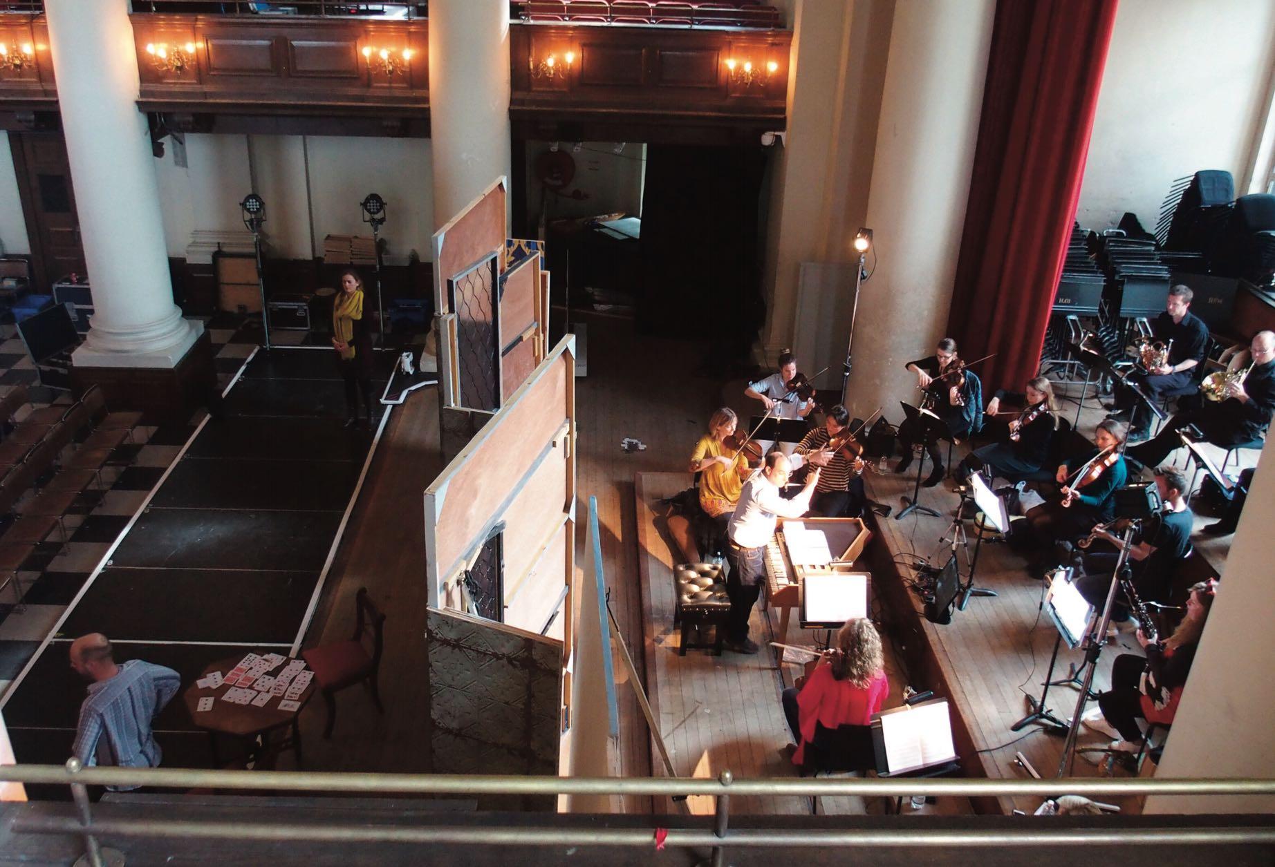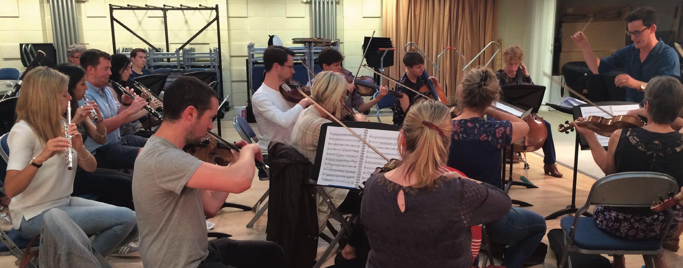 The orchestra meets and rehearses several times during the week preceding the Bampton performances, beginning with a session in London. In Bampton, orchestra and singers work together in a purely music rehearsal, without acting, which is held in the church: this is known as the Sitzprobe (literally, a ‘sitting rehearsal’).