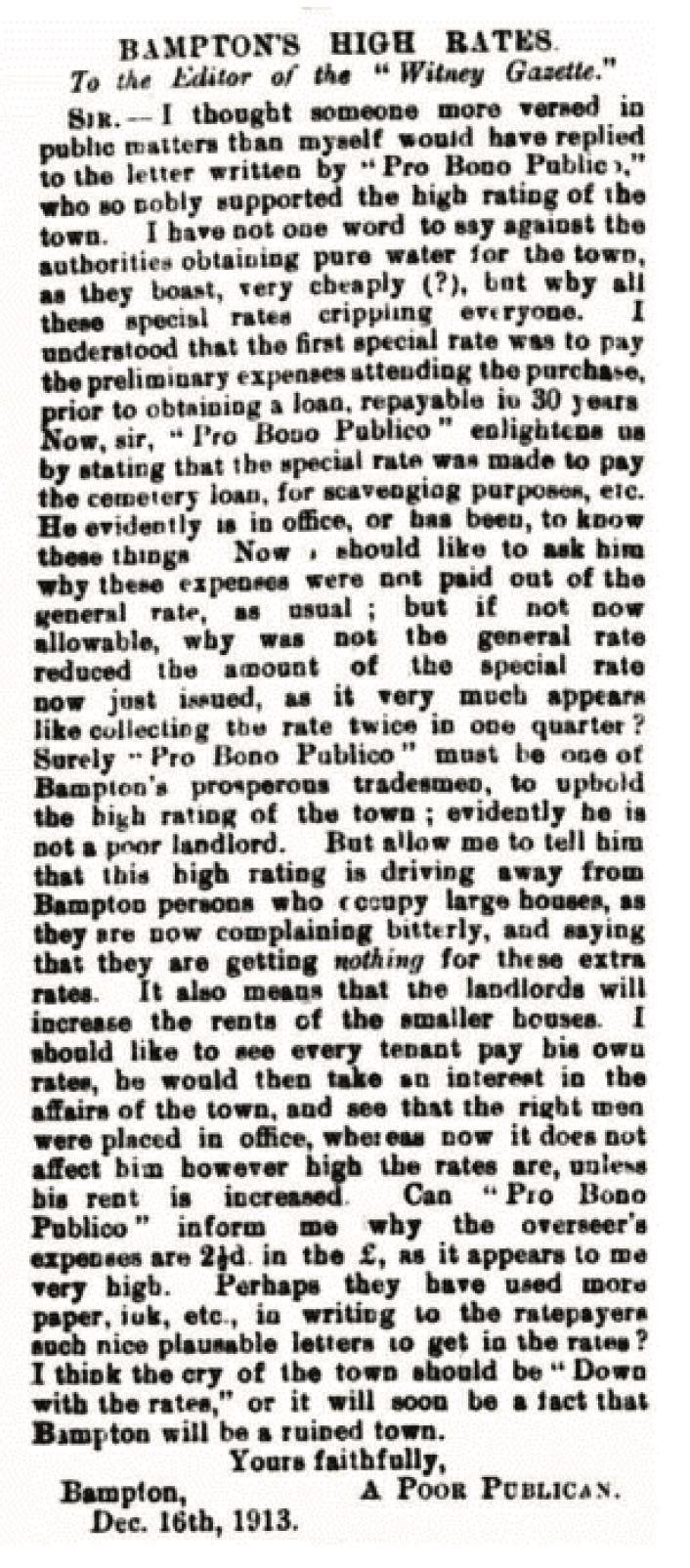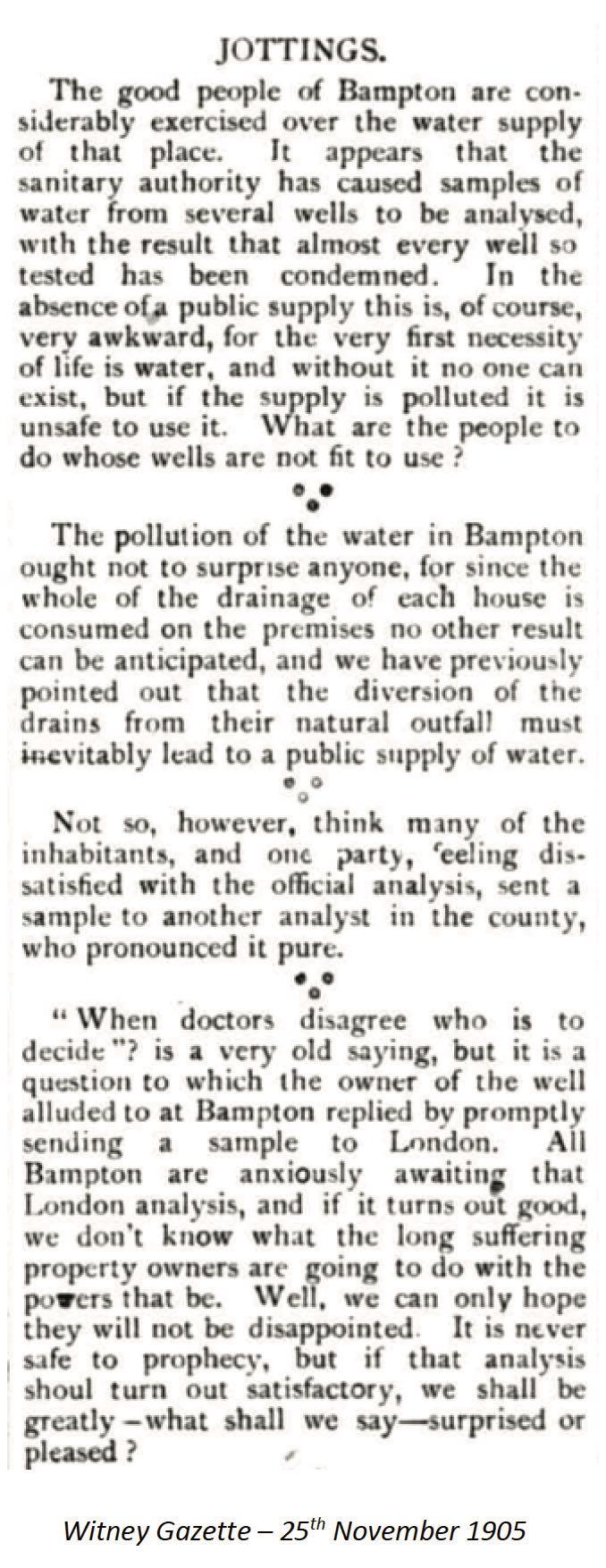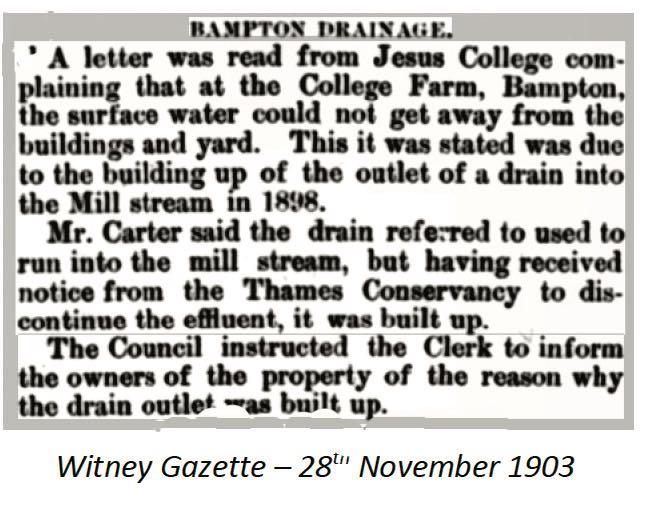 While the Thames Conservancy had apparently carried out work to greatly reduce flooding in Bampton, residents in the Buckland and Aston Road still experienced a flow back of sewage from their drains after heavy rain. This was at the root of significant concern about plans for the STW to include sewage from Aston and Cote, which would likely make the existing problem even worse.