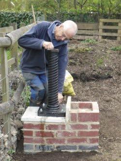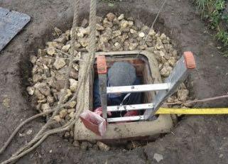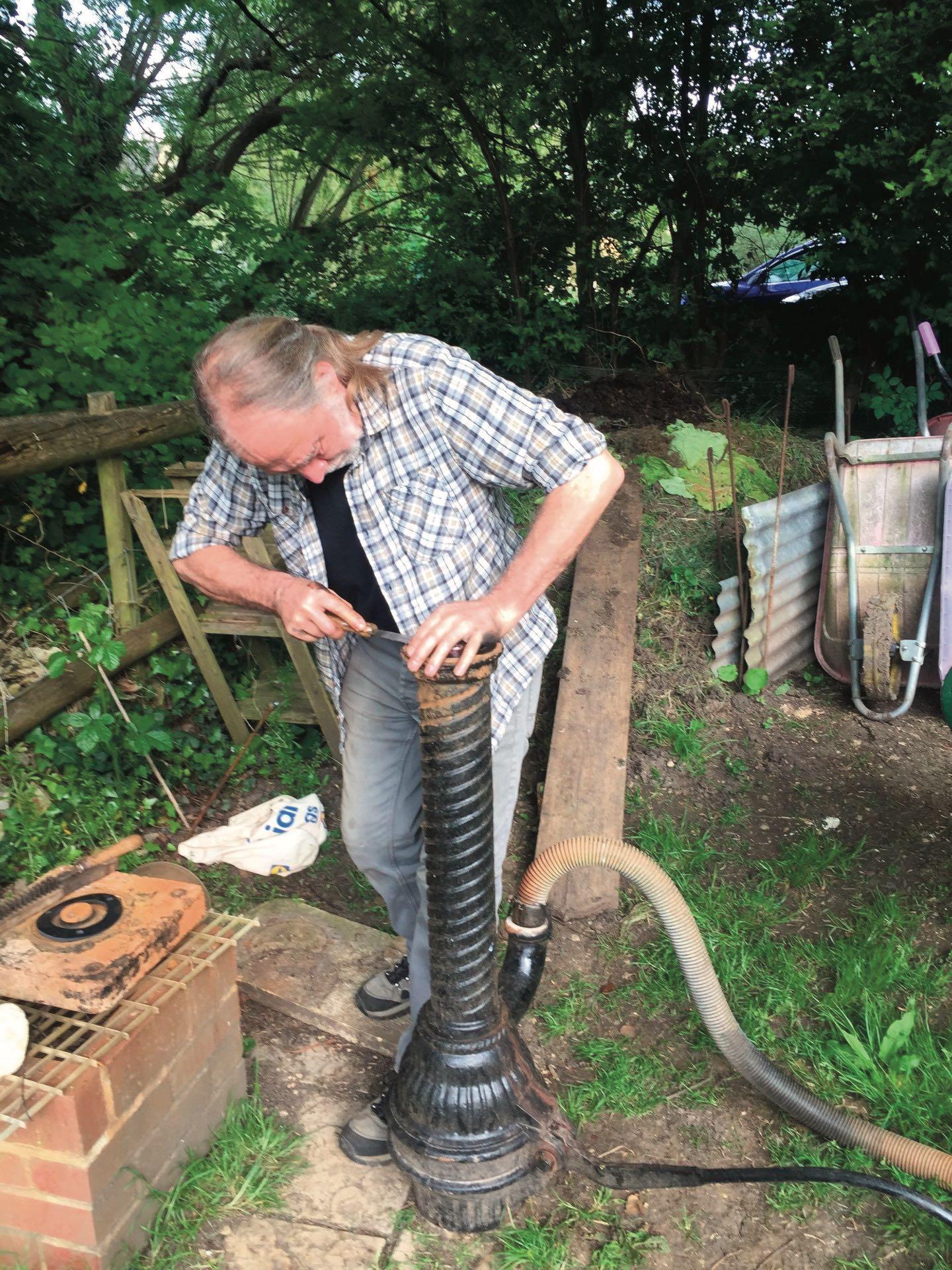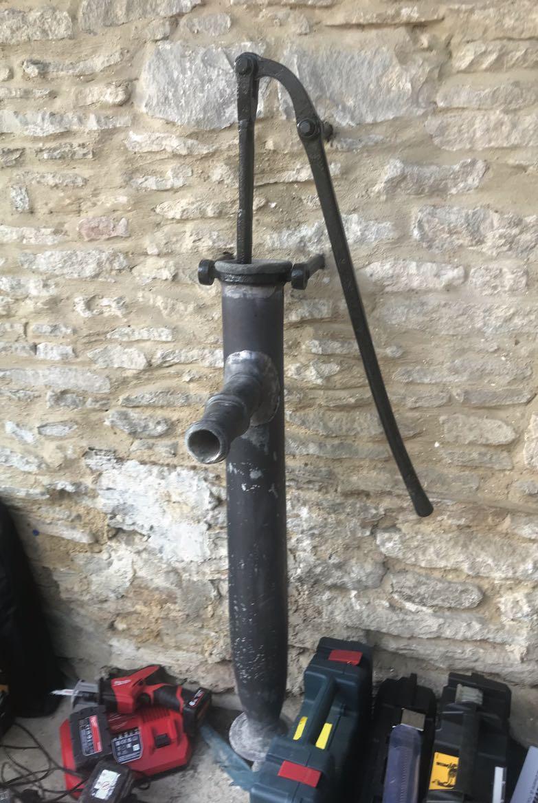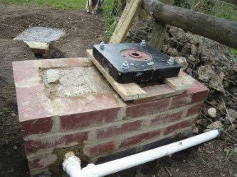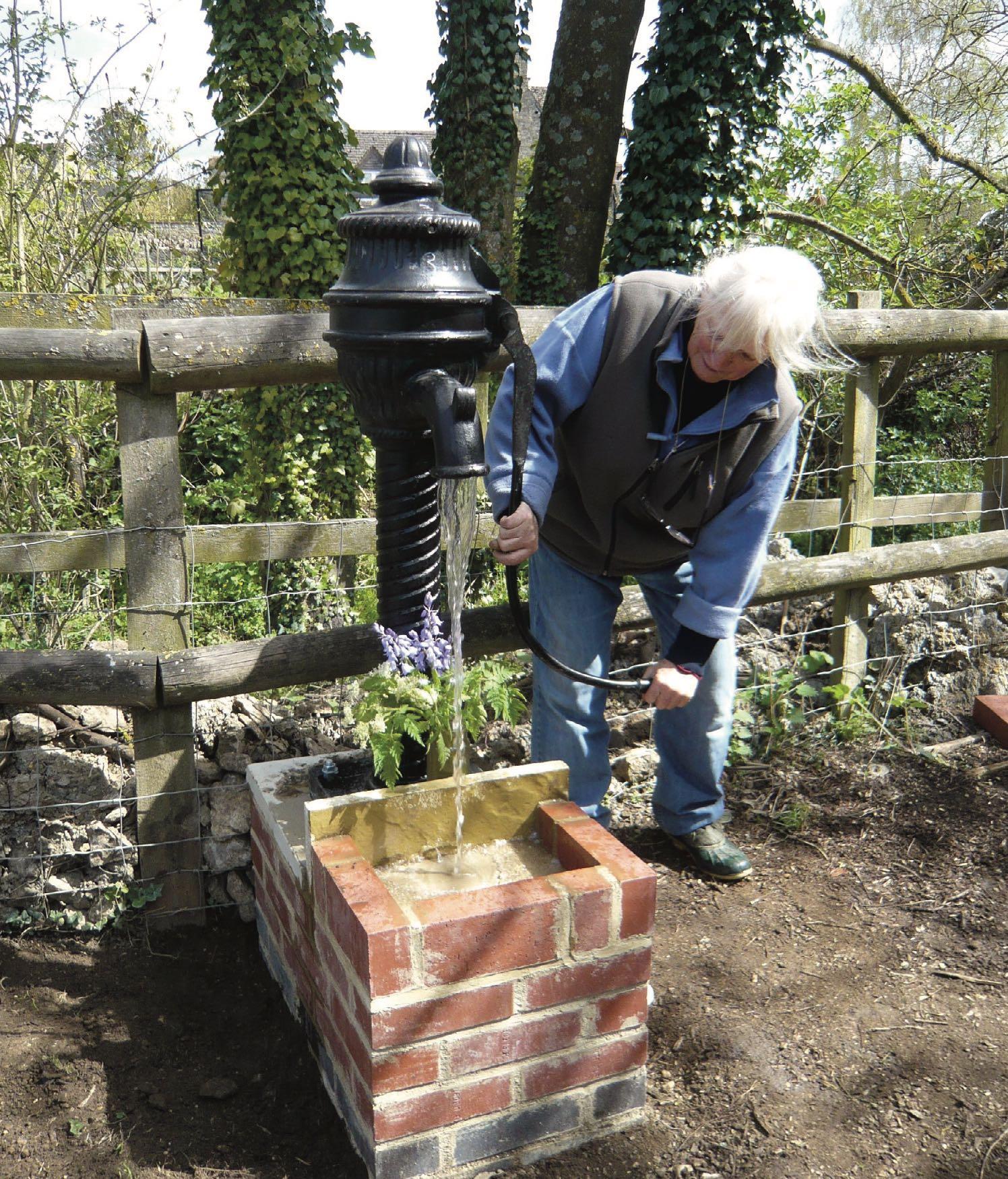They found that the gravel layer starts 2-3ft down and water table is at 5-6ft depth. A wooden ring was initially laid at the bottom of a shallow dug circular hole (any wood is suitable for this type of construction). Then the first few layers of bricks are placed on top of the ring, mortared and allowed to set. The ground underneath is then excavated and the mortared ring sinks. This technique provides protection for the digger. Quite a few fossils were encountered during the excavation. Mortared engineering bricks were used in the construction right from the base to the top, hence the well walls are effectively waterproof, and the water enters from the bottom of the well. Once the well reaches the required depth, it is capped and a manhole cover inserted, for future access. The hand pump, which is lift or suction design, was offset from the well. Waders are also clearly an essential part of the modern well digger’s kit!