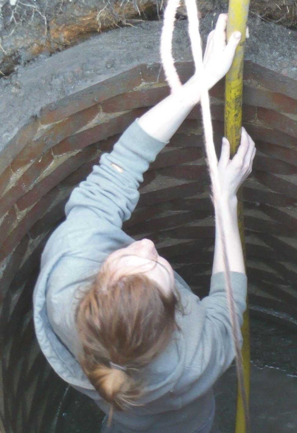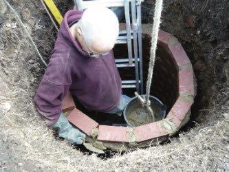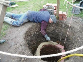 Traditional well digging was a hard and dangerous job but it was relatively well paid; not unsurprisingly as there was a reported death ratio of 2 in 5, but without well diggers people had no water, so demand was high. Wells were ubiquitous but there are no official records of hand dug wells. Nevertheless, whether digging or restoring or cleaning a well you always end up with a cold bum. Near the bottom and often even after just a few metres from the top, water enters the well and trickles down the sides of the well walls. Typically, well linings are open-jointed with the stones or bricks just placed on top of each other, although the top 1-2 m of lining is often mortared to stop surface water run-off from contaminating the well. Some recent 20th century wells have used curved fired bricks but usually they are made from normal rectangular engineering bricks set at an angle on top of each other. With around 272 bricks per meter of well the current cost is about £250/m for the bricks alone. Wells are on average 100cm diameter so inevitably you find that when bending down your bum touches the sides pretty much most of the time, which means a wet and cold bum. This is not exactly a perk of the job! Hence, the well-known expression (?) “It’s Colder than a Well Diggers arse”. Just don’t ask!