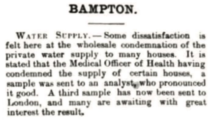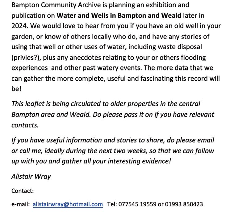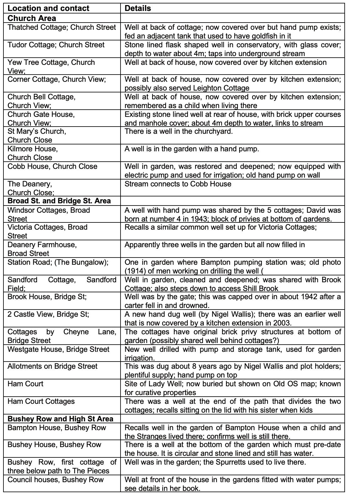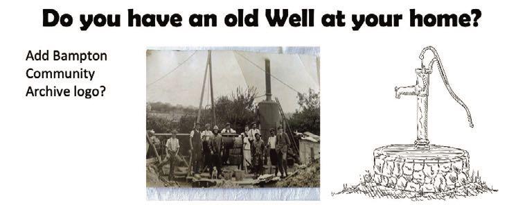 Information on wells has been obtained via online literature searches, from the Ordinance Survey map published in 1899 and from existing publications in the Bampton Community Archive, and posts on the “Memories of Bampton” website, supplemented by a survey distributed to older properties in the Bampton and Weald area. Conversations with older residents, including members of the Bush Club, have also yielded valuable memories and anecdotes.