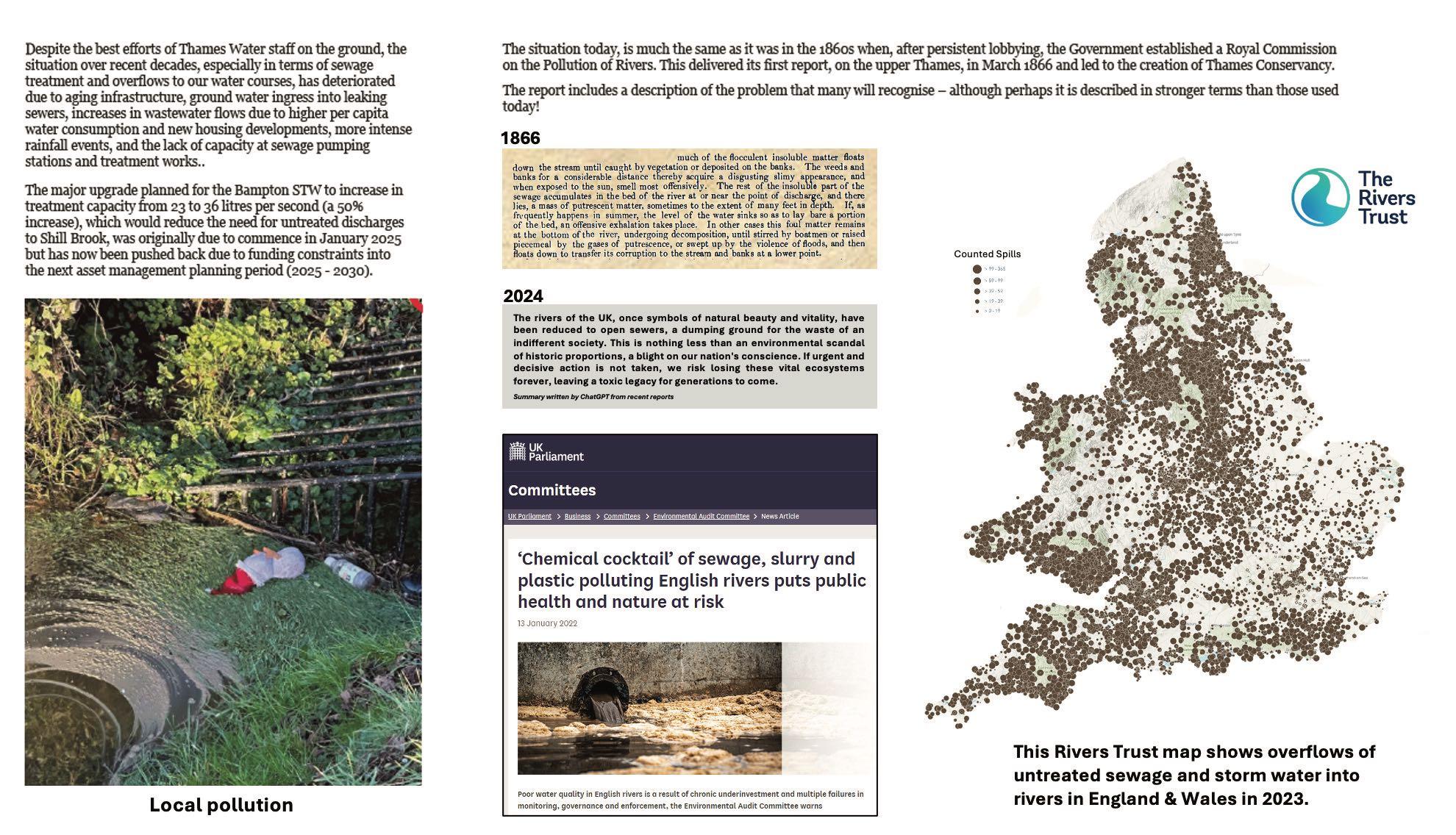 Despite the best efforts of Thames Water staff on the ground, the situation over recent decades, especially in terms of sewage treatment and overflows to our water courses, has deteriorated due to aging infrastructure, ground water ingress into leaking sewers, increases in wastewater flows due to higher per capita water consumption and new housing developments, more intense rainfall events, and lack of capacity at sewage pumping stations and treatment works.
