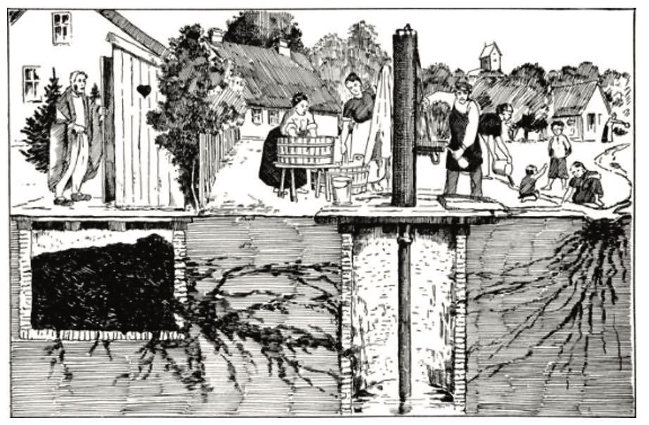 Water is essential for all life and how we have accessed safe drinking water, and indeed the safe disposal of our waste, has crucially shaped lives in the past. Collecting safe water was time consuming (and still is in many parts of the world) but the use of simple hand-dug wells transformed lives in Bampton over past centuries and for many their use continued to shape the daily pattern of family life here up until the 1950’s. Well water would have been drawn up by hand in buckets or large water bags and later using hand pumps, of which examples can still be seen.
