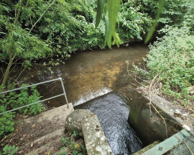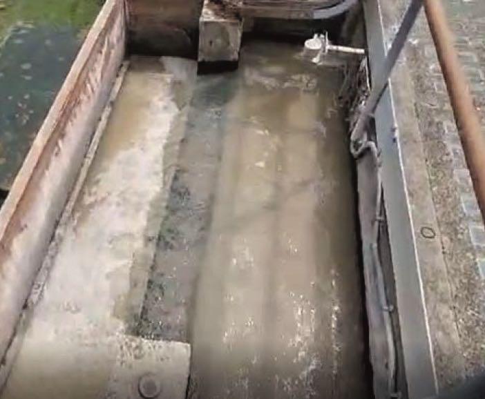 The screened water passing through, with a level-controlled gate. When the flow is too high, the extra water goes over the lip on the left and into a trough from which it empties into the overflow tank.