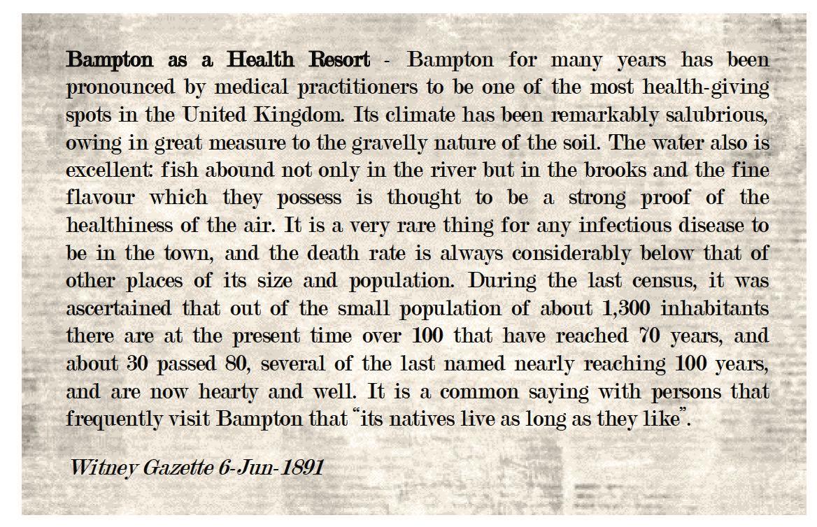 “The climate of Bampton is considered to be remarkably salubrious, owing in great measure, to the gravelly nature of the soil. The water is also excellent, except in situations where it is exposed to contamination from decayed vegetable-matter. Fish abounds, not only in the river, but also in all the brooks; and the fine flavour which they possess, is thought to be a strong proof of the healthiness of the air.