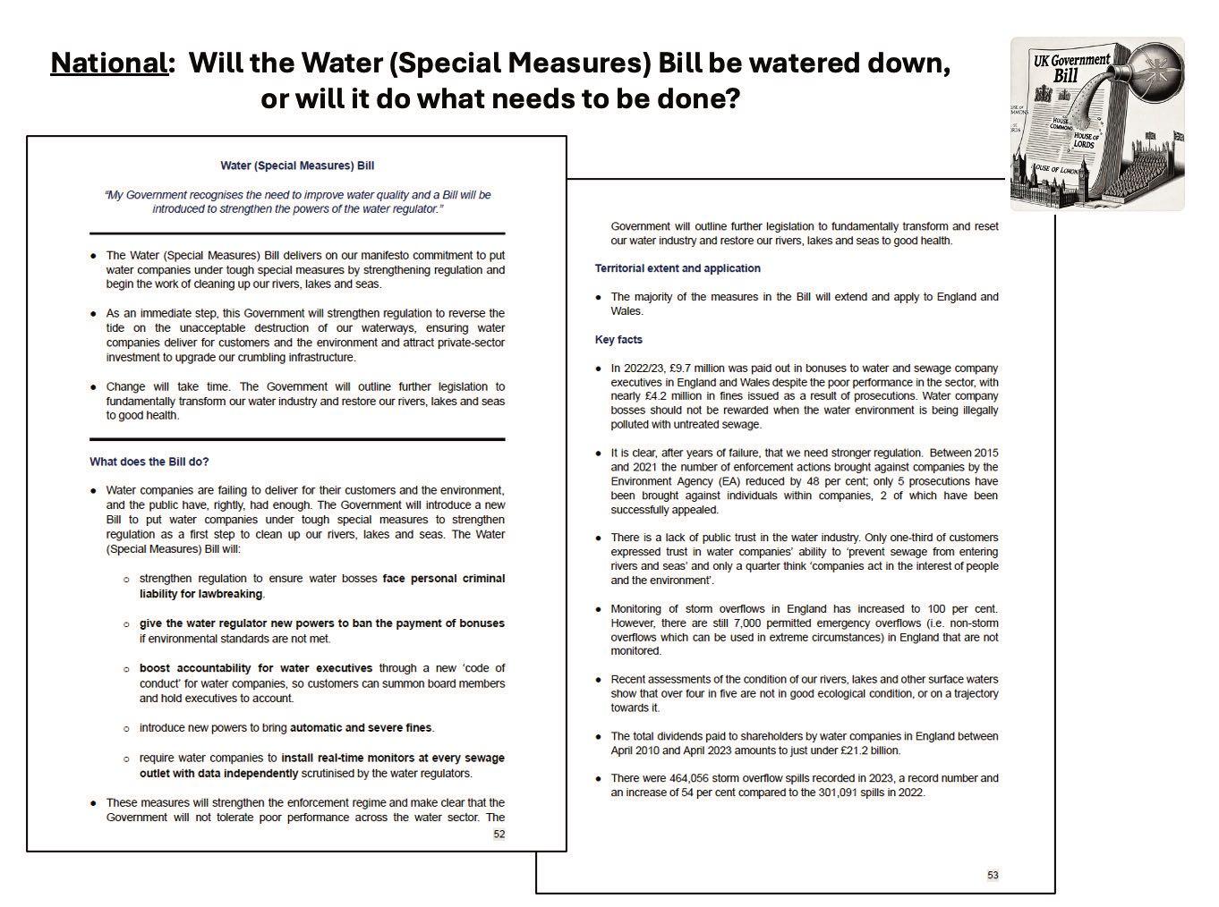 It is only very recently that Ofwat has ‘woken up’ to the problems it has allowed to happen by turning a blind eye to the financial chicanery by the water companies; and, in March 2023 it announced new powers that allow it to stop the payment of dividends if they would risk the company’s financial resilience, and to take enforcement action against water companies that don’t link dividend payments to performance. This has been picked up and taken forward in the Water (Special Measures) Bill included in the Kings Speech on 17th July 2024.