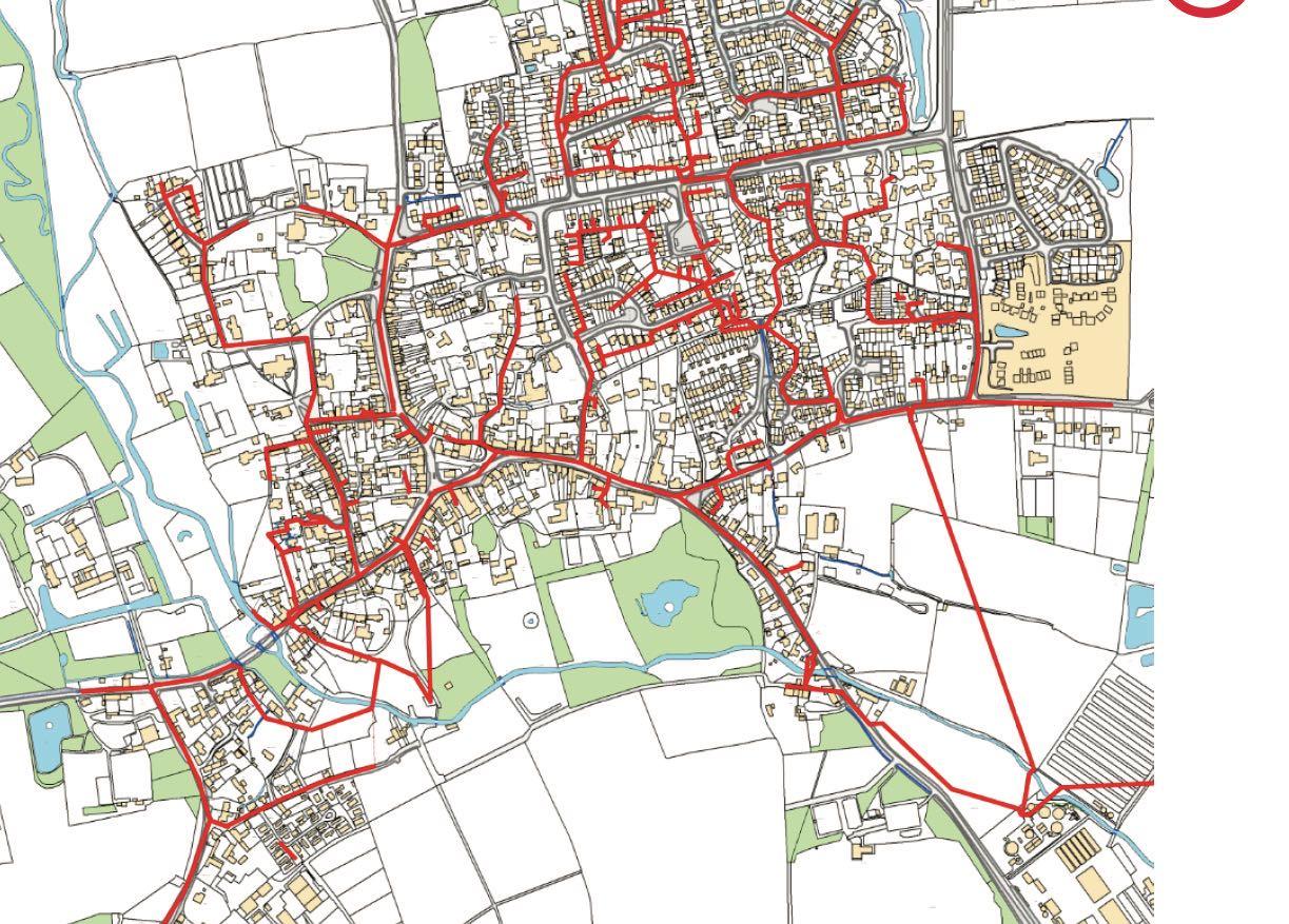 Map of Sewerage System in Bampton provided by Thames Water in Jul 2023 Red lines have been overdrawn to make them visible on the map. The original map shows them as thin red dtted lines which are identified on the key as Foul Sewers rather than Combined Sewers