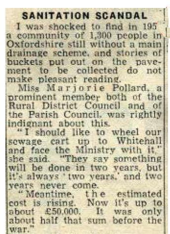 Mains sewerage was finally installed in Bampton in 1959 after a campaign led by Marjorie Pollard who lived at the Deanery until 1982. Marjorie was a force to be reckoned with and, as shown in the following excerpt from the Oxford Mail in November 1954 was proposing to take direct action unless the sewerage installation went ahead. A later article added that when Horace Morse died in the late 1950s there was no alternative to going ahead with the mains drainage.