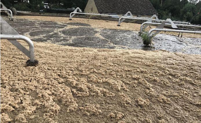The second part of the process. The screened sewage is then pumped to the aeration tank where naturally occurring bacteria break down the waste into carbon dioxide, water, organic matter and also convert ammonia into nitrates. At the same time, the bacteria replicate and grow.