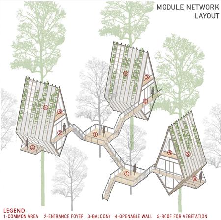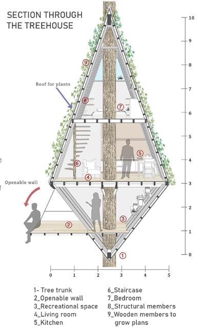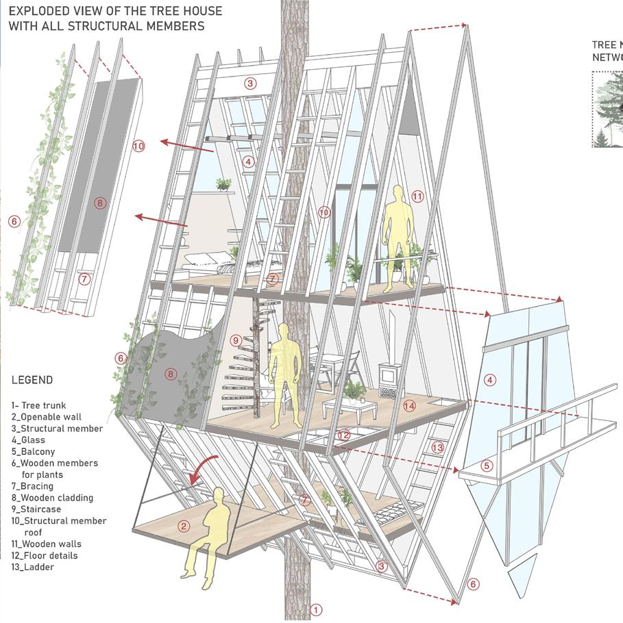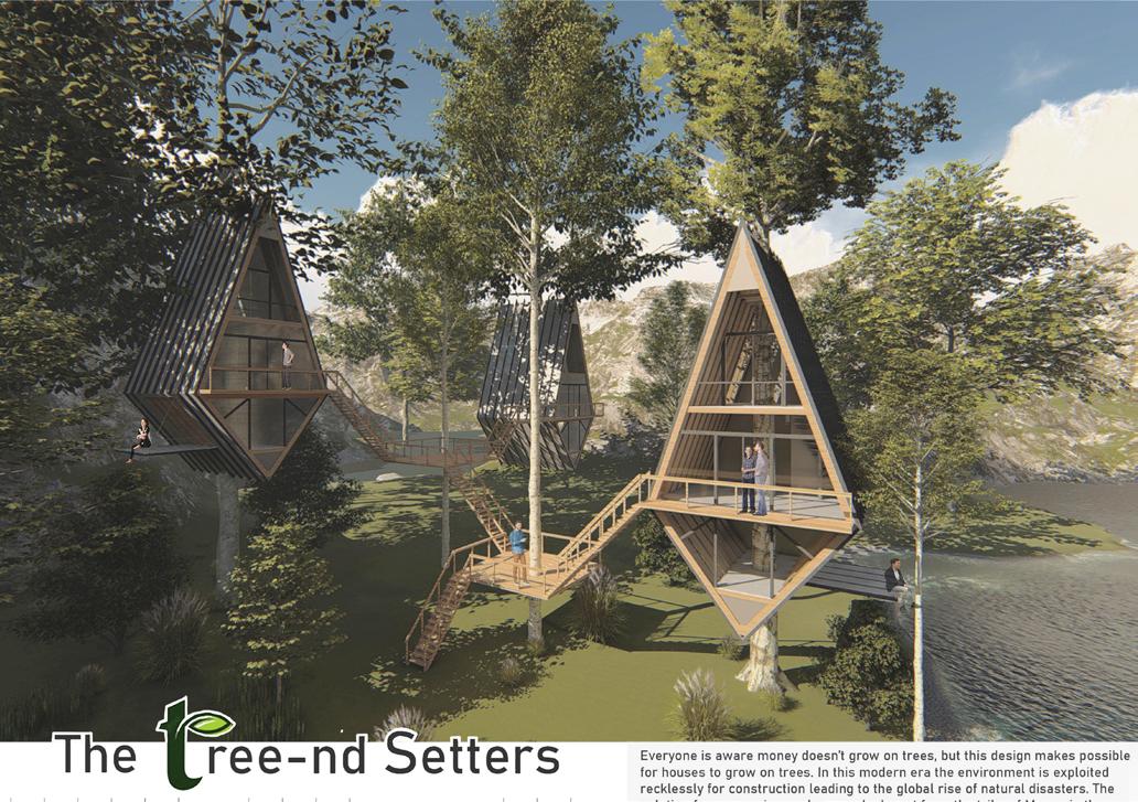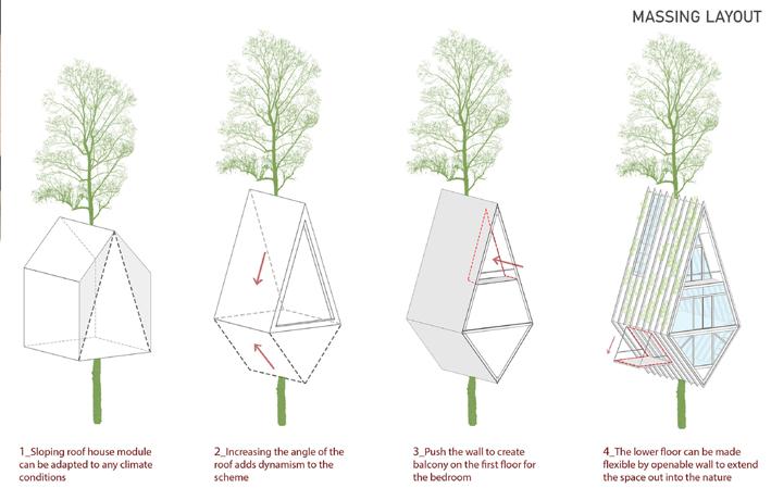 This treehouse design aims to pave the way for a futuristic design solution that merges with nature in order to conserve the existing habitat as seen in the elevations and massing.