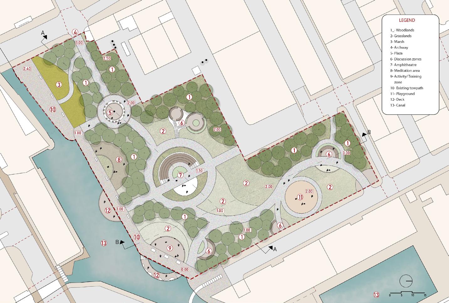 The aim was to foster inclusivity for the youth associated with this organization. Central to this vision was the strategic integration of previously unused spaces with the adjacent canal and its surroundings. To guide visitors on their journey through the park, a thoughtful arrangement of woodlands and grasslands was implemented, creating a visually engaging frame.
