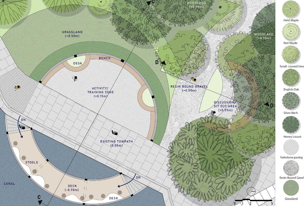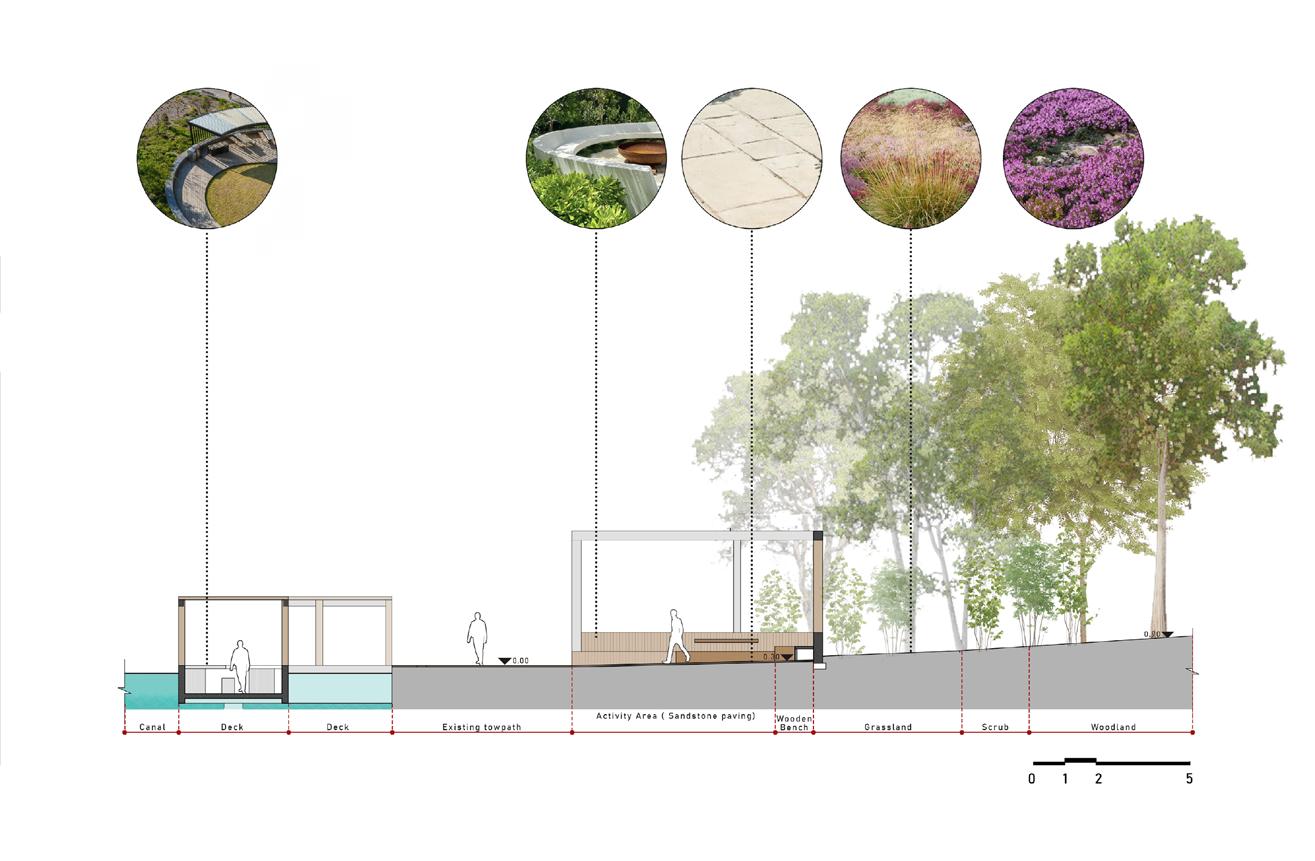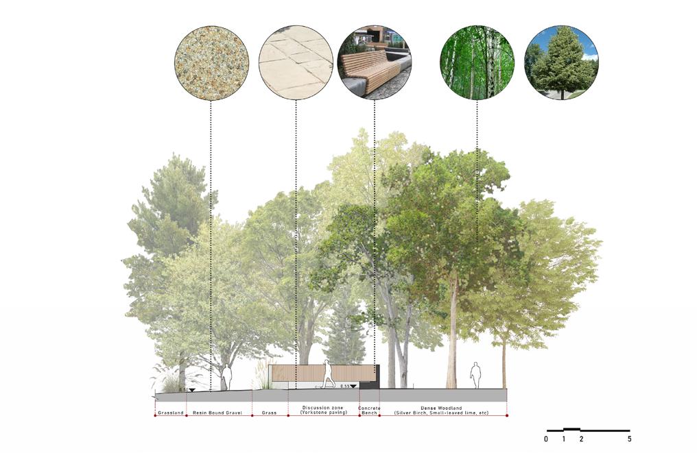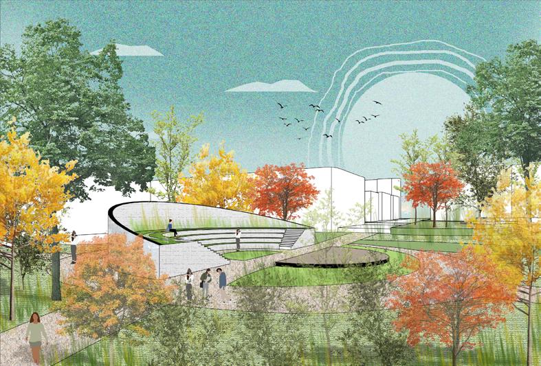 Biodiversity enhancement: I strategically integrated green zones into the site which would harmoniously coexist with the existing flora, providing space for well-being gardens, pollinatorfriendly gardens, wildflower meadows, and more.
