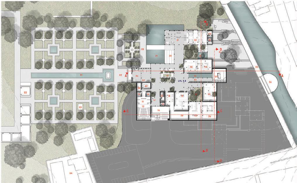 LEGEND 01- FOUNTAIN 02- FOYER 04- RESIDENTIAL BLOCK 05- GARDEN 06- LOBBY 07- TICKET BOOTH 08- PRACTICE ROOM 09- MEETING AREA 10- GREEN ROOMS 11- STAGE 12- AUDITORIUM 13- COMMON SEATING 14- SERVICE COURT 15- TOILETS 16- SURVELLANCE ROOM 17- COURT 1 18- LAB 19- GALLERY 2 20- STORAGE 21- COURT 2 22- GALLERY 3 23- GALERY 4 24- AUDIO ROOM 25- PASSAGE 26- WATER FEATURE 27- COURT 4 28- GALLERY 1 29- AUDIO ROOM 30- AMPHI 31- TOURIST CENTRE 32- CAFE 33- KITCHEN 34- SITOUT SPACE 35- FORT WALL 36- BASTION GROUND FLOOR PLAN