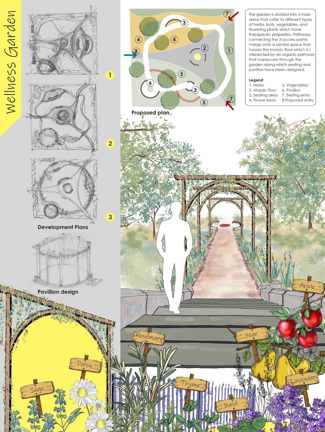 on the book by Catherine Dee, threshold, foci and pathways can be designed to elevate the landscape. Some conceptual ideas representing the same have been illustrated here.