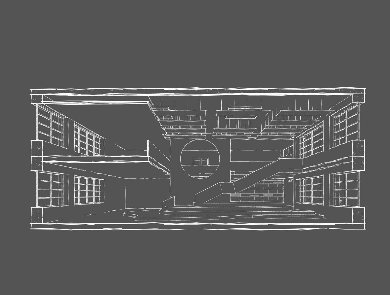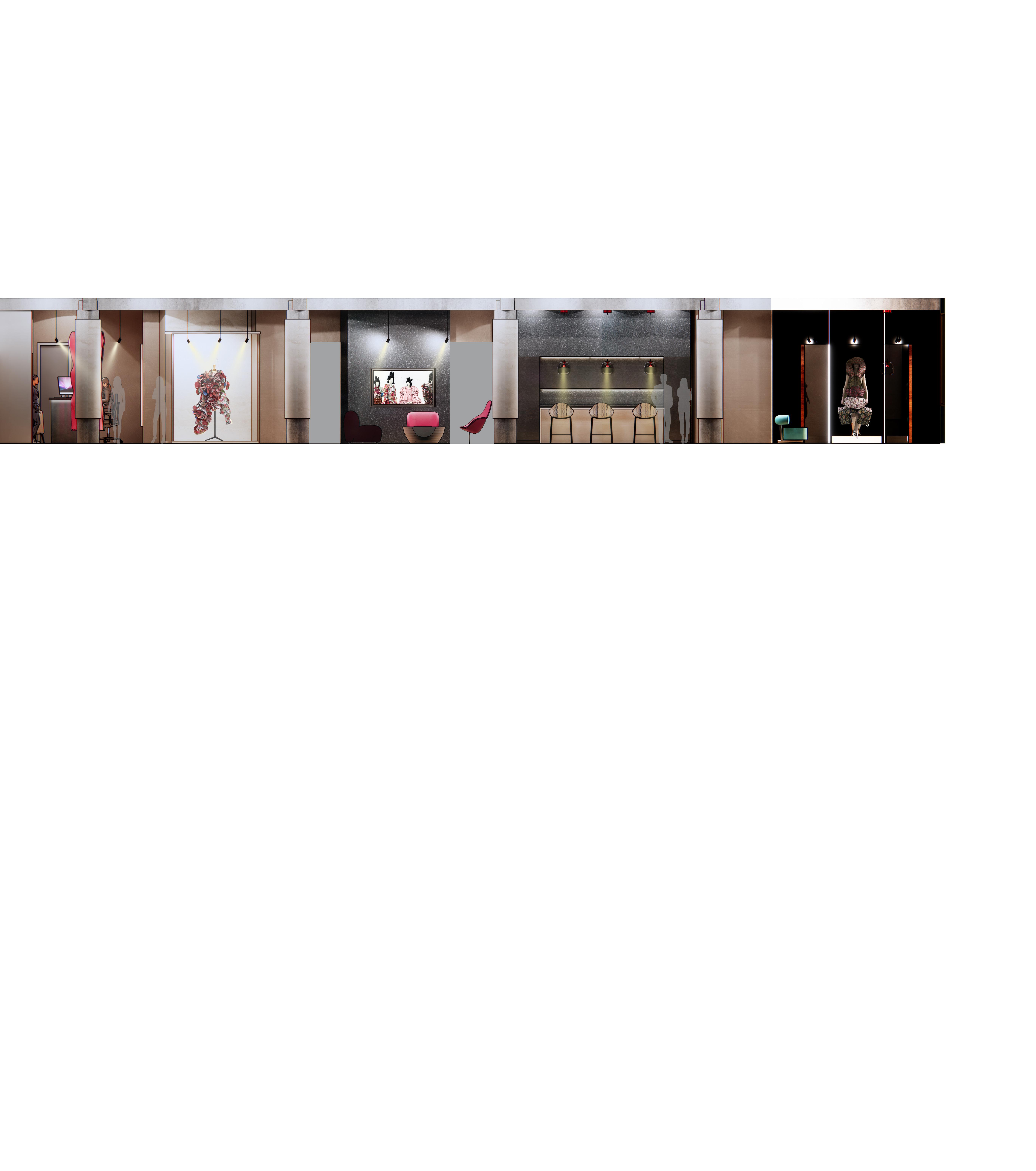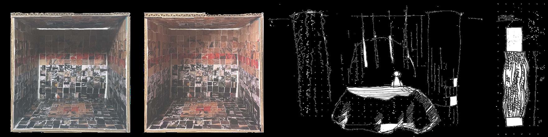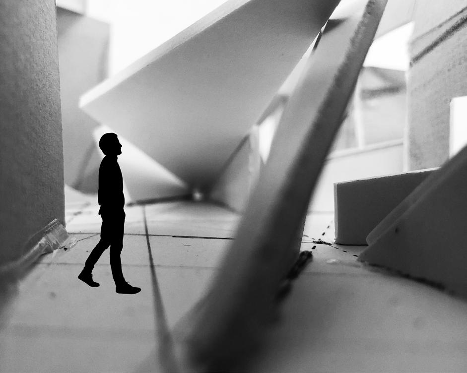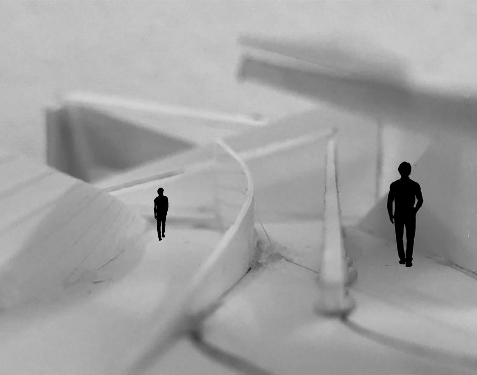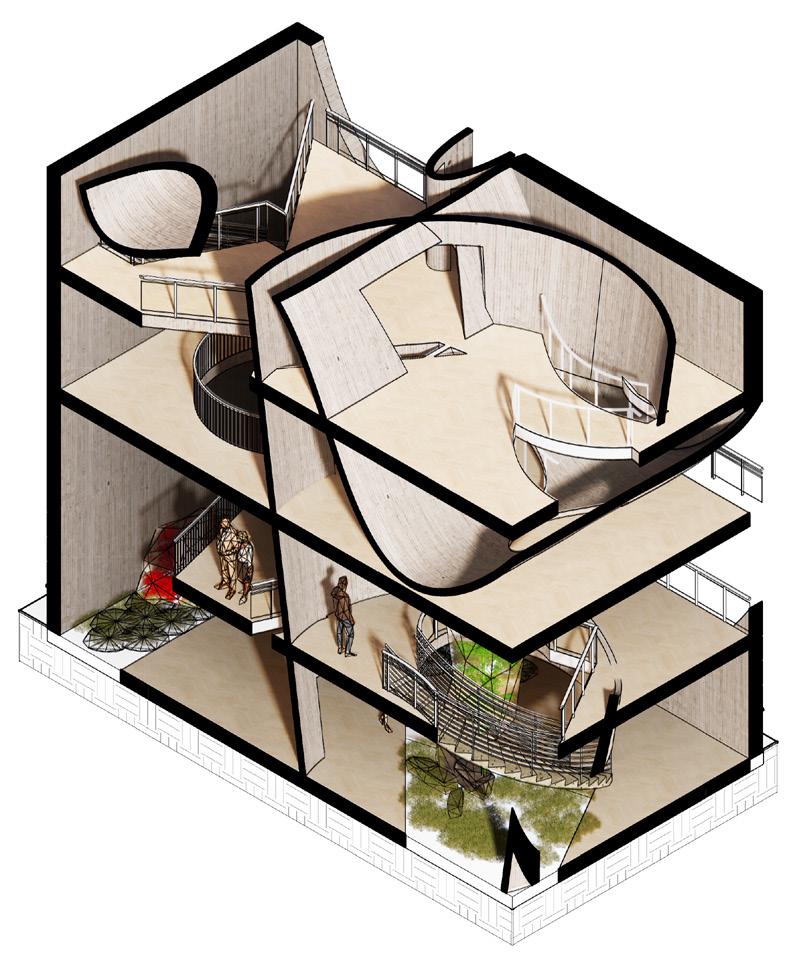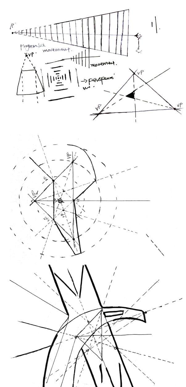 The idea of dynamic intensity of the multi perspective is highly inspired by Borrormini’s false perspective and Zaha Hadid’s idea of multi perspective. Some of the physical wall panels create the change between visual 2 dimension to 3 dimensional interior space. Both physical models are based on multiple combinations of Borromini’s progressive perspective. In the model each vanish point is a key hot spot where communication starts. Dynamic perspective in architecture is about creating a sense of visual interest and movement and depth that engages the viewer and encourages them to explore and interact with the space.