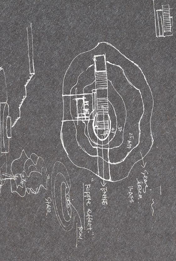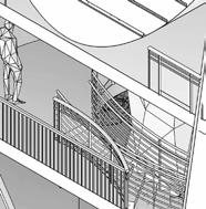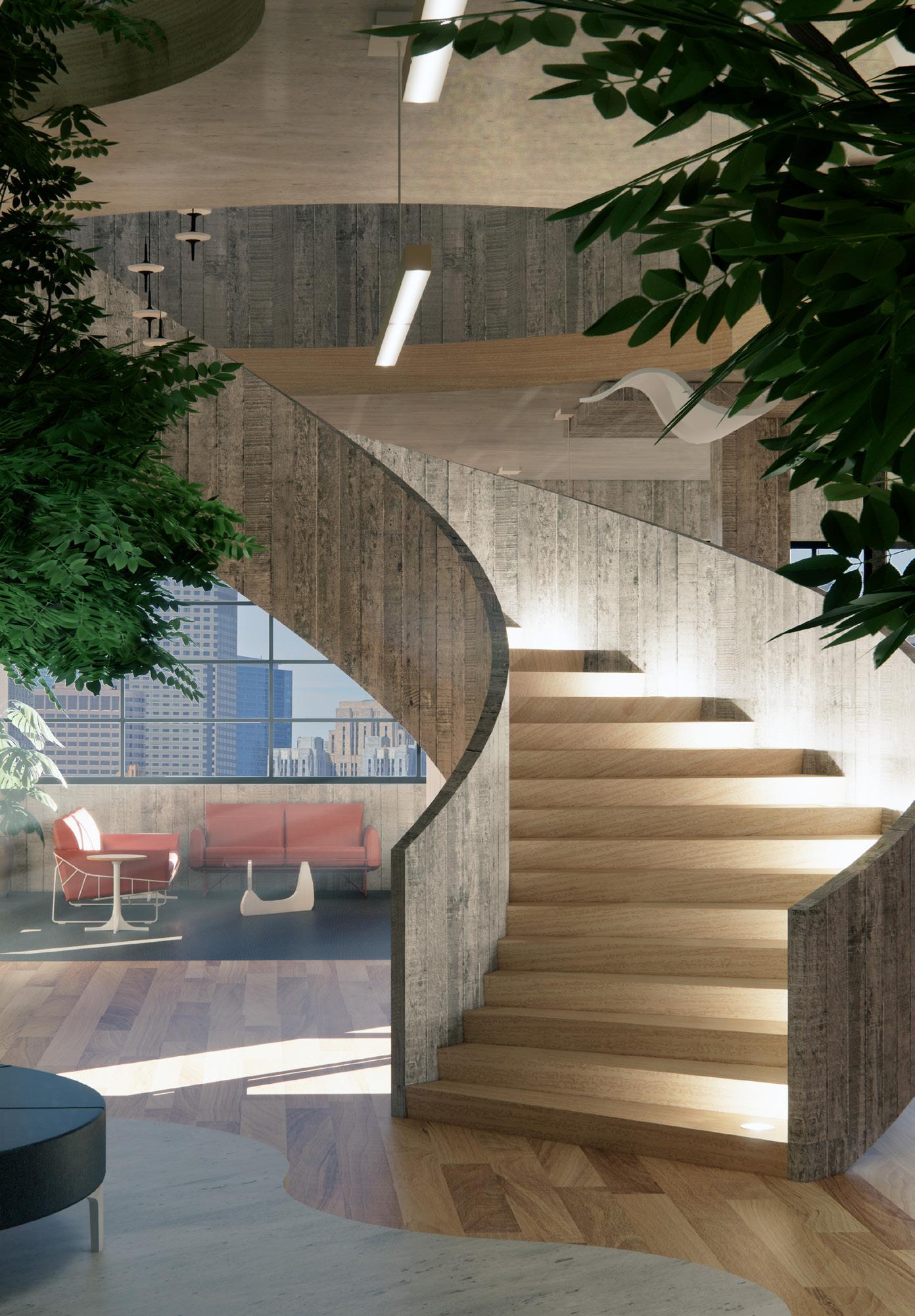 VERTICAL CIRCULATIONS ARE NOT JUST FOR EMPLOYEES BUT ALSO USED AS SEATING AND LOUNGE AREAS. THE JUXTAPOSITION OF TWO STAIR FORMS ARE WAY-FINDING STRATEGIES, GEOMETRIC AS PUBLIC AND CURVILINEAR AS PERSONAL SPACE.