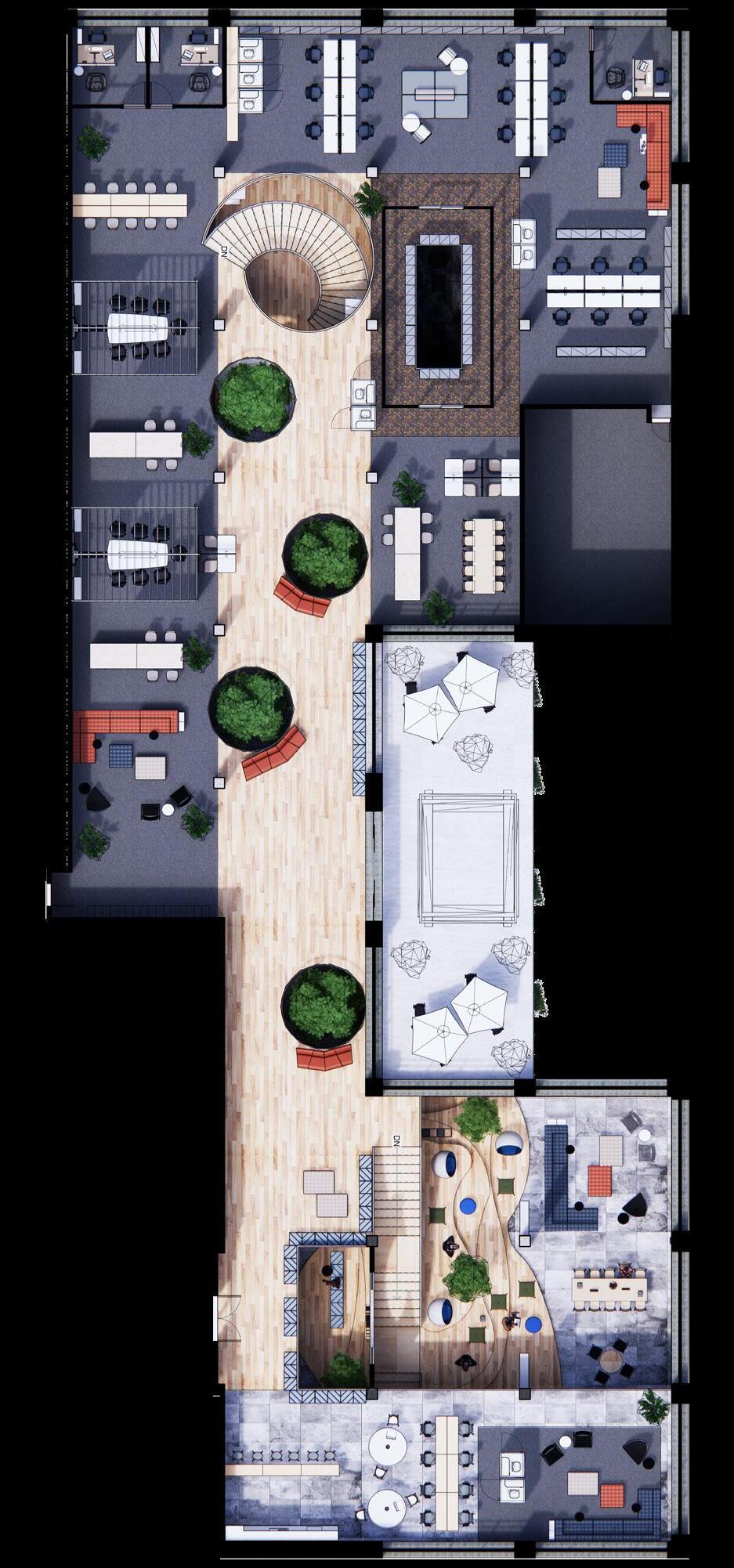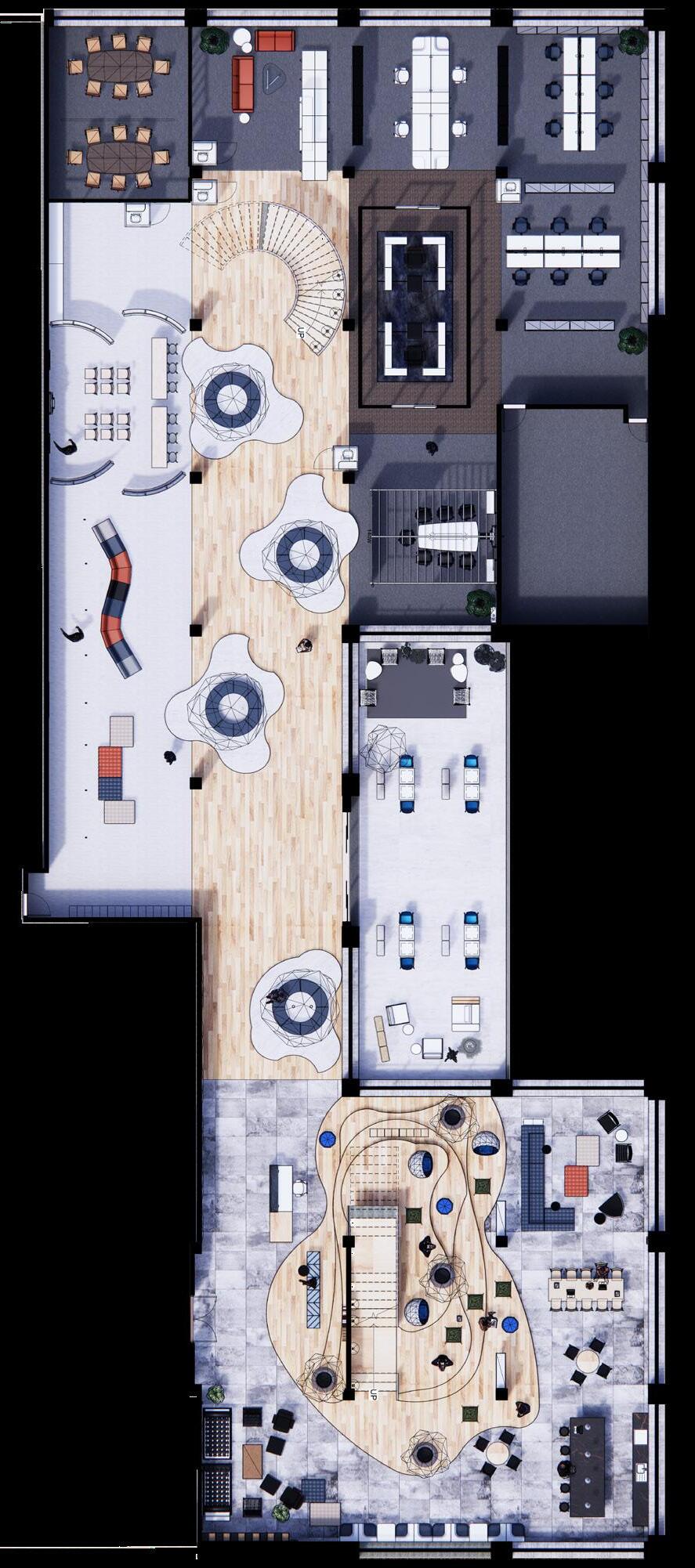 Immanent Garden is modern open concepts style office for the innovative company The Agency T&A. The mimic of an Indoor Garden provides immeasurable benefits to the workplace. The circular geometry and lush greenery create a sense of intimacy, but also encourage free and flexible interaction between employees. The use of indoor plants not only improves indoor air quality and reduces noise, but also increases motivation in the workplace, and contributes to the improvement of the overall well-being of the workplace. The goal is to create a sense of community and unlike traditional workplaces by providing multiple gathering places for employees to enjoy.