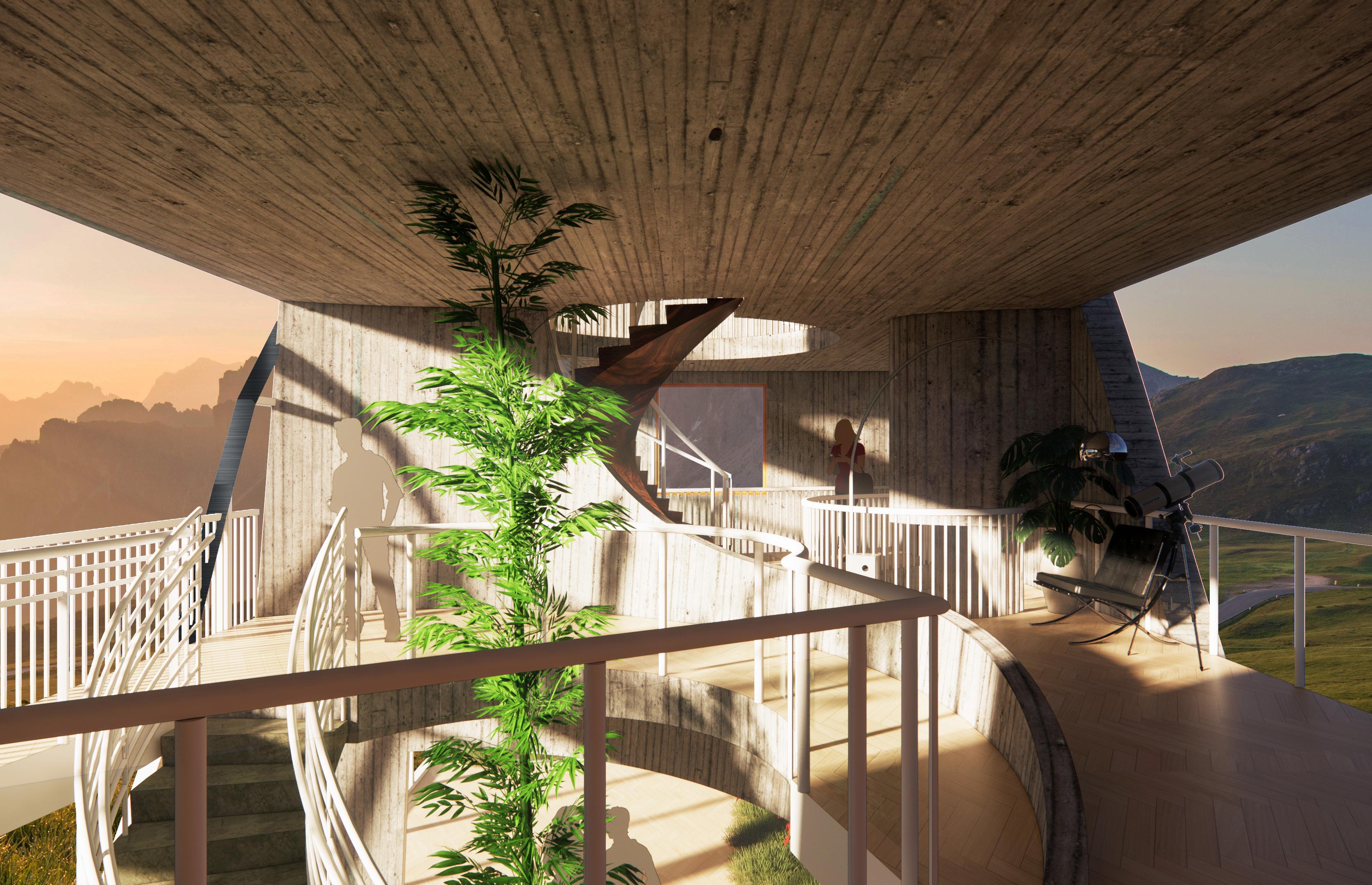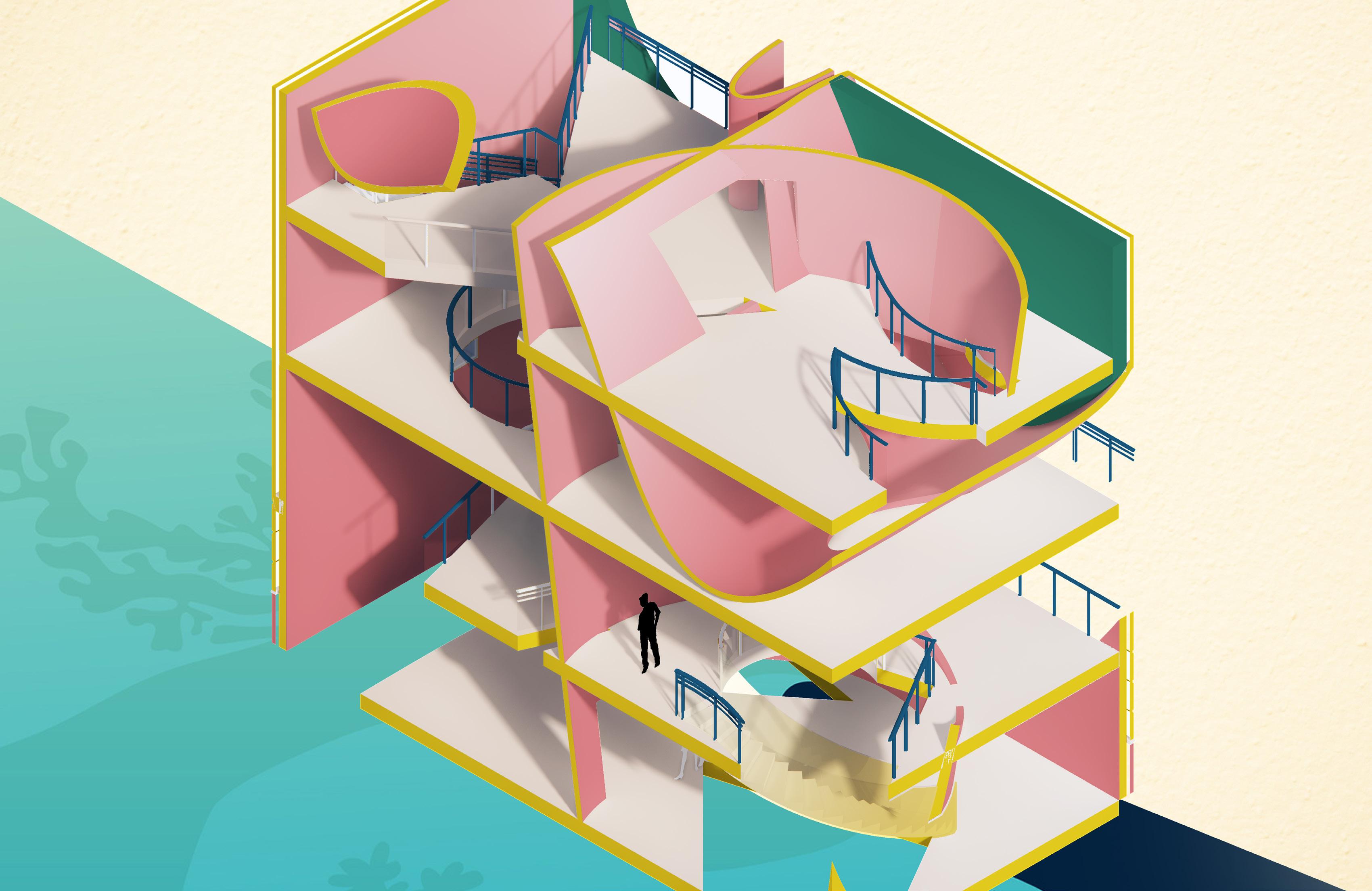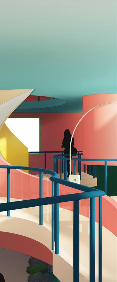 The concept of fluid movement is a synthesis and presentation of the graphic analysis and skills learned from the iconic design firm Work-ac. The use of gradient colors follow the movement of vertical and horizontal structure. This project is designed for the local community and aimed at community gatherings and play areas for kids. The design goal of this space is to create a space to relax and find moments of peace and joy and cope with post-pandemic anxieties. The use of fluid and geometric forms creates a movement and dynamic interior and exterior space. The openings in the middle floors smoothly harmonize the interior and exterior. The intended site is Namtso Tibet.