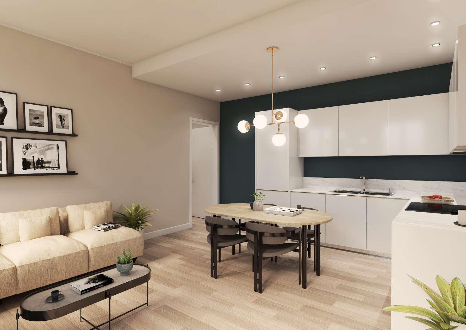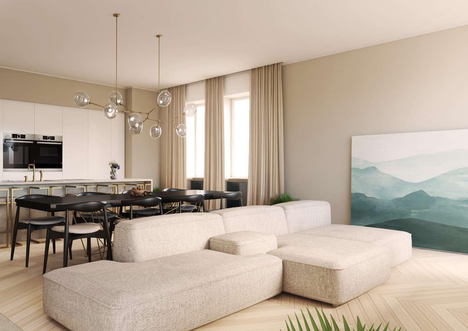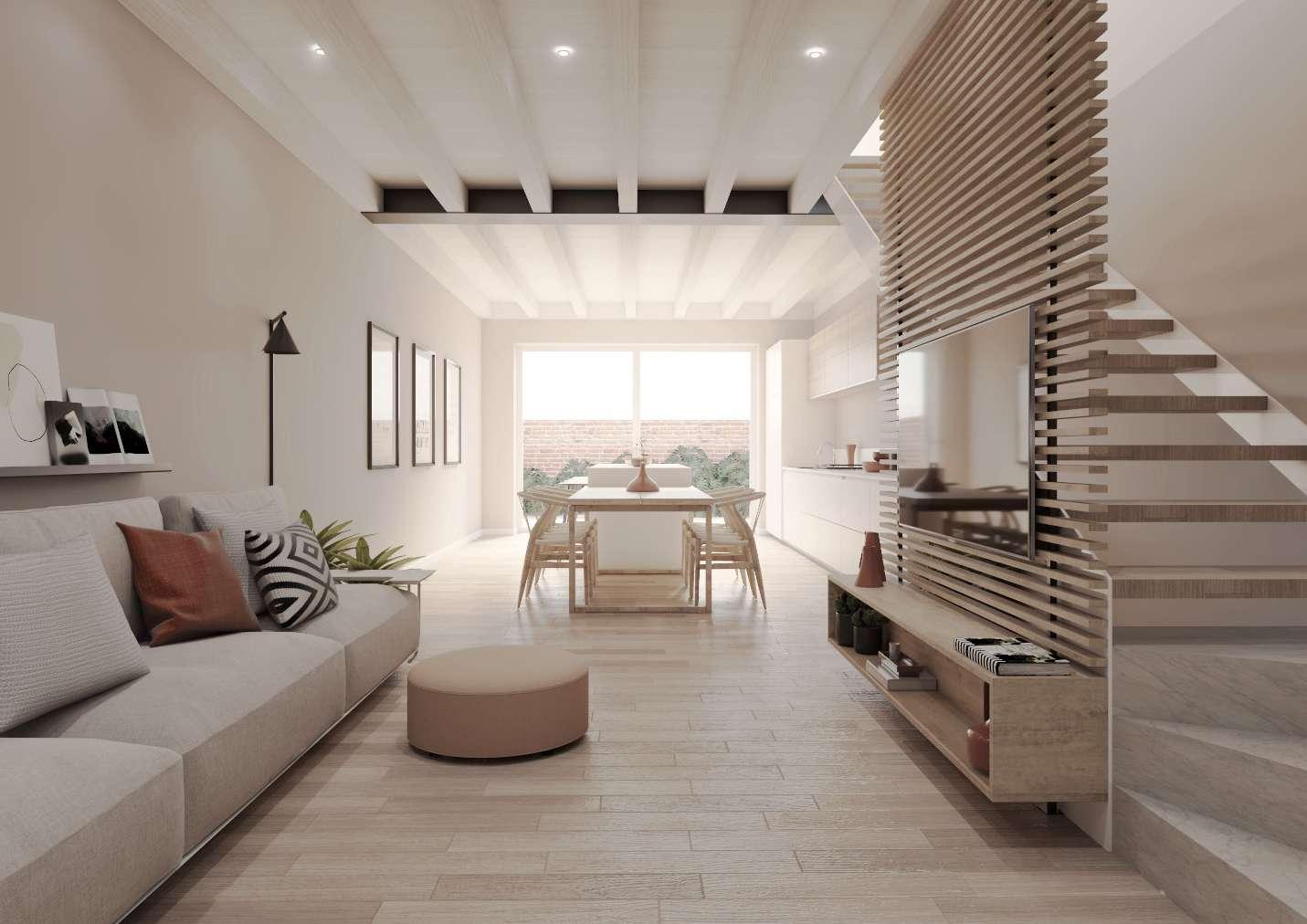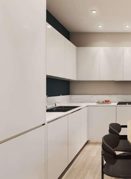 La cucina e zona living sono open-space per dare maggiore respiro alle ampie vetrate che si affacciano sul terrazzo privato.